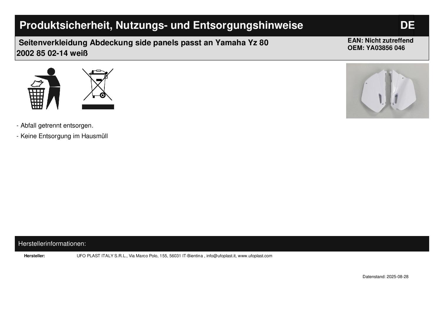 Seitenverkleidung Abdeckung side panels passt an Yamaha Yz 80 2002 85 02-14 weiß