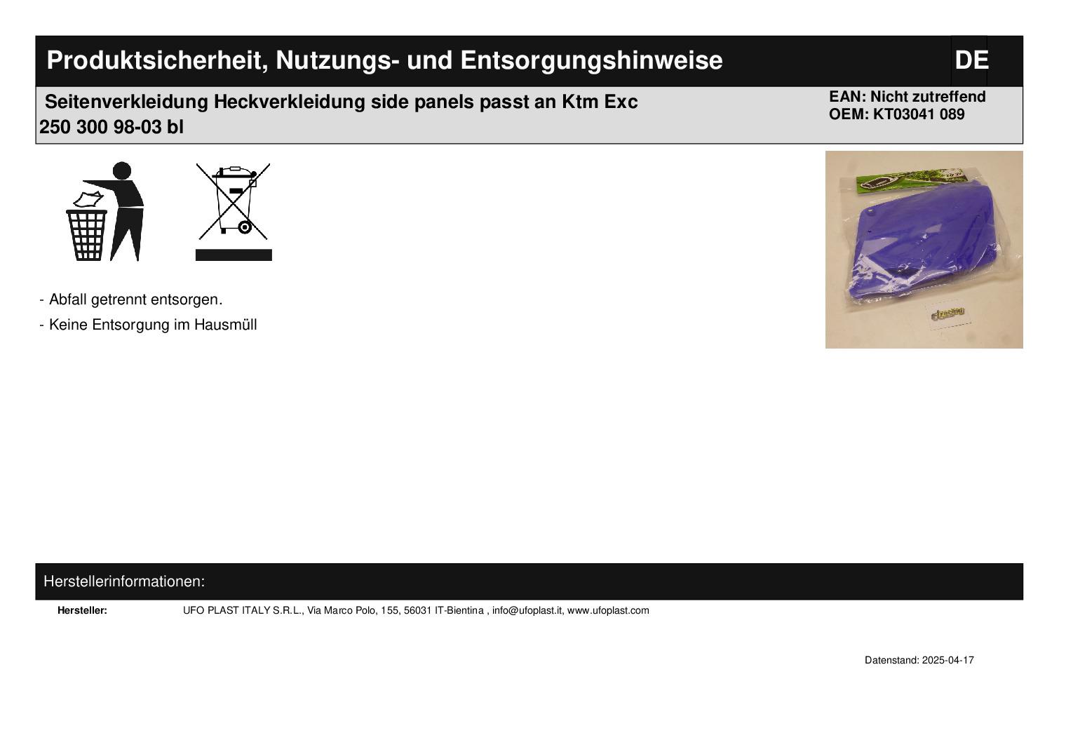 In dieser Auktion gibt es folgenden Artikel zu kaufen: Seitenverkleidung (siehe Foto) Modell: passend für KTM EXC 360, 200, 300 Bj.: 1998 - 2003 EXC 380, 400, 520 620 Bj.: 2000 - 2003 SX 250, 360, 125, 200, 300 Bj.: 1998 - 2003 SX 380, 400, 520, 620 Bj.: 2000 - 2003 Lieferumfang: siehe Foto Artikelzustand: neu aus Geschäftsauflösung mit minimalen Lagerspuren; Zustand siehe Foto Bei Unklarheiten oder Fragen bitte erst E-Mail schreiben.