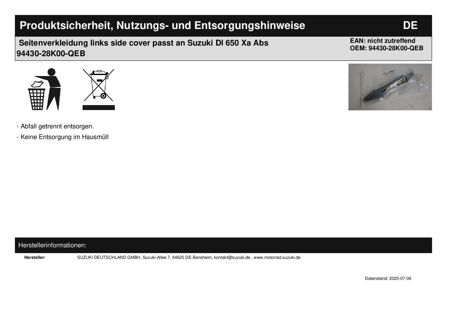 • Seitenverkleidung links side cover passt an Suzuki Dl 650 Xa Abs 94430-28K00-QEB