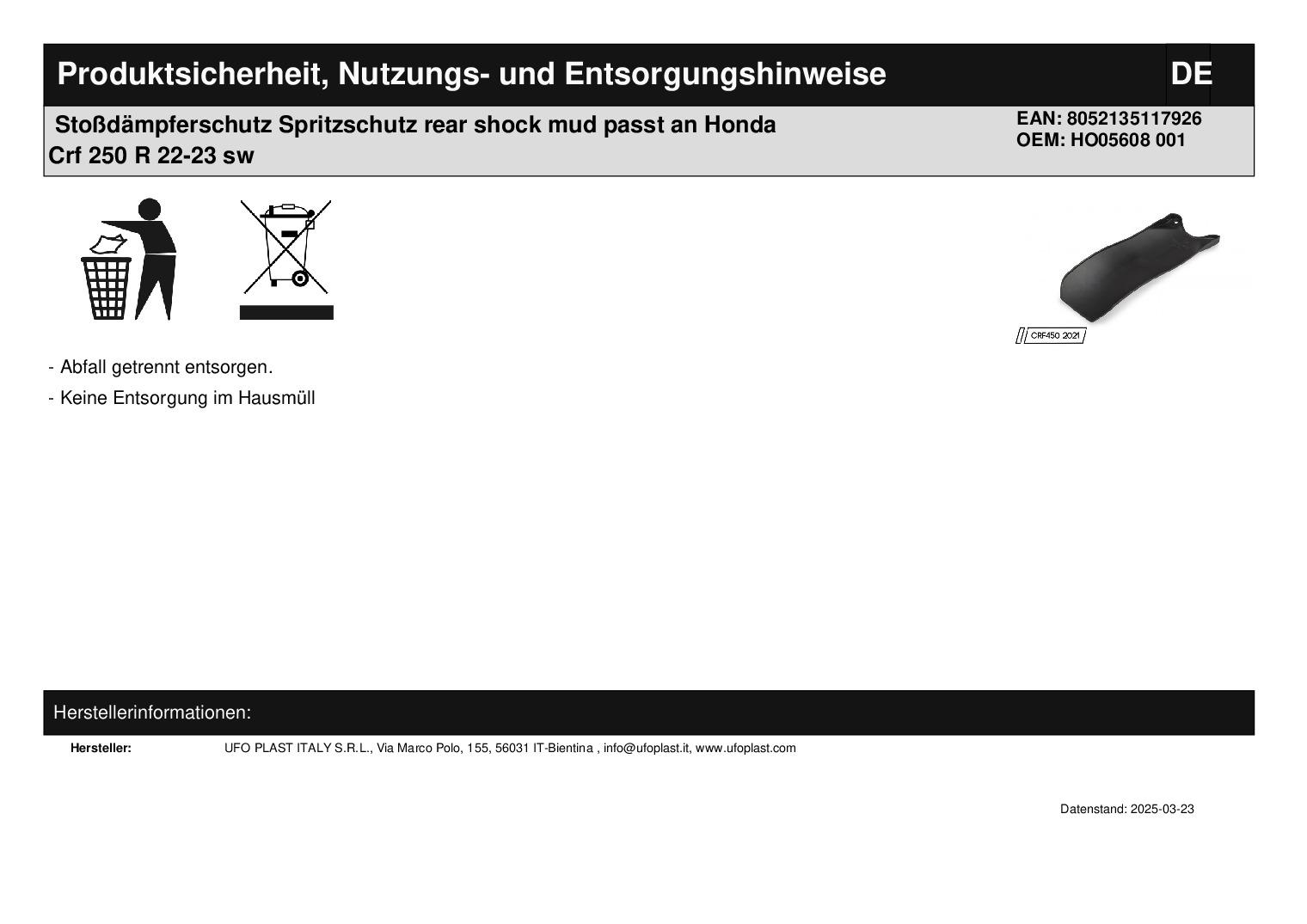 In dieser Auktion gibt es folgenden Artikel zu kaufen: Spritzschutz (siehe Foto) Modell: passend für Honda CRF 250 R Bj.: 22 - 23 CRF 250 RX Bj.: 22 - 23 CRF 450 R Bj.: 21 - 23 CRF 450 RX Bj.: 21 - 23 Lieferumfang: siehe Foto Artikelzustand: neu Es handelt sich hierbei um kein Originalteil Bei Unklarheiten oder Fragen bitte erst E-Mail schreiben.