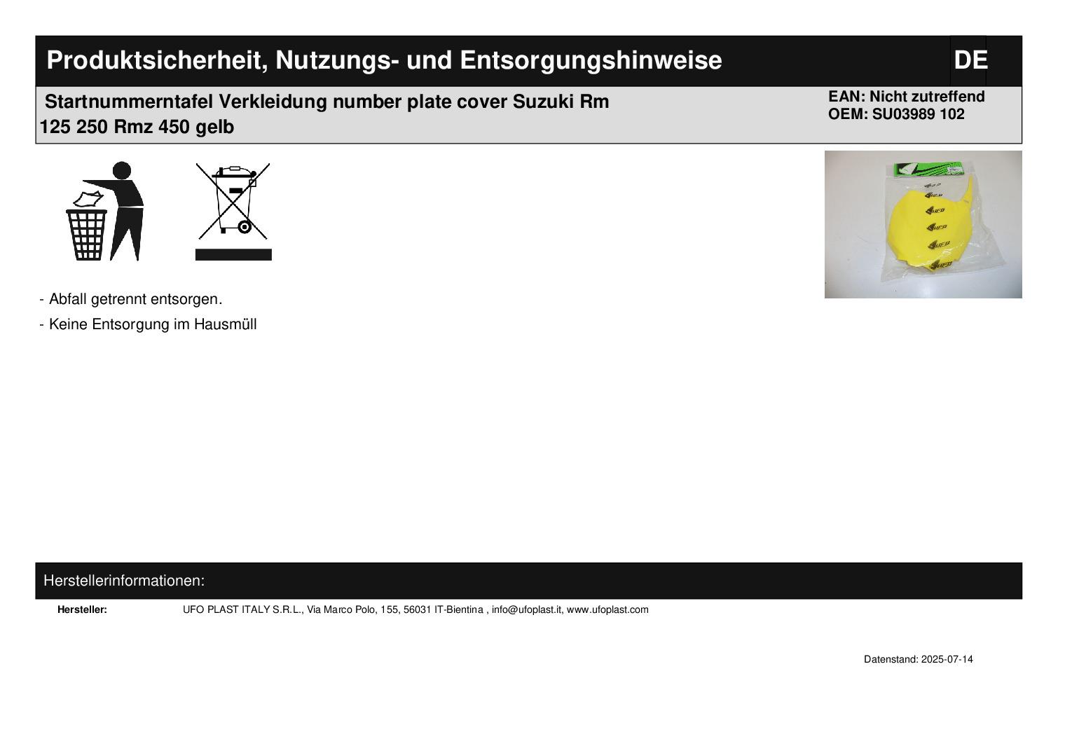 In dieser Auktion gibt es folgenden Artikel zu kaufen: Startnummerntafel (siehe Foto) Modell : passend für Suzuki RM 125 Bj.: 01 - 07 RM 250 Bj.: 01 - 09 RMZ 250 Bj.: 07 - 09 RMZ 450 Bj.: 05 - 07 Lieferumfang: siehe Foto Artikelzustand: neu aus Geschäftsauflösung, mit minimalen Lagerspuren; Zustand ähnlich Foto Bei Unklarheiten oder Fragen bitte erst E-Mail schreiben.
