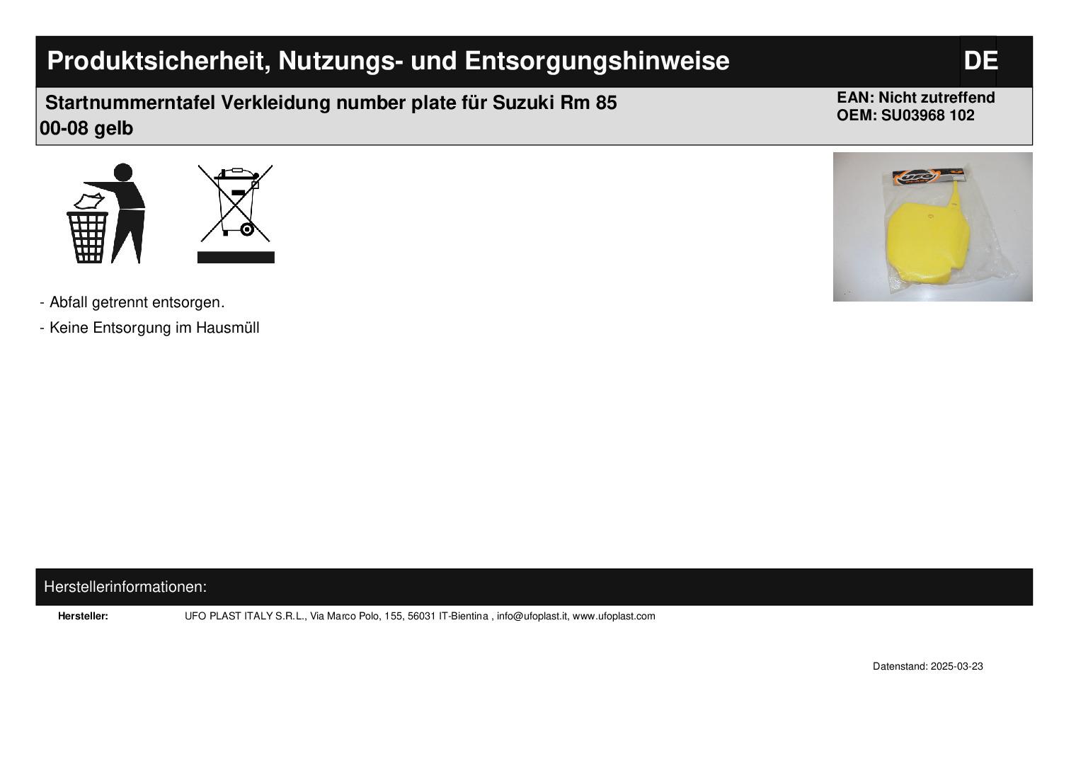 In dieser Auktion gibt es folgenden Artikel zu kaufen: Startnummerntafel (siehe Foto) Modell: passend für Suzuki RM 85 Bj.: 00 - 08 Lieferumfang: siehe Foto Artikelzustand: neu aus Geschäftsauflösung, mit minimalen Lagerspuren; Zustand siehe Foto Bei Unklarheiten oder Fragen bitte erst E-Mail schreiben.