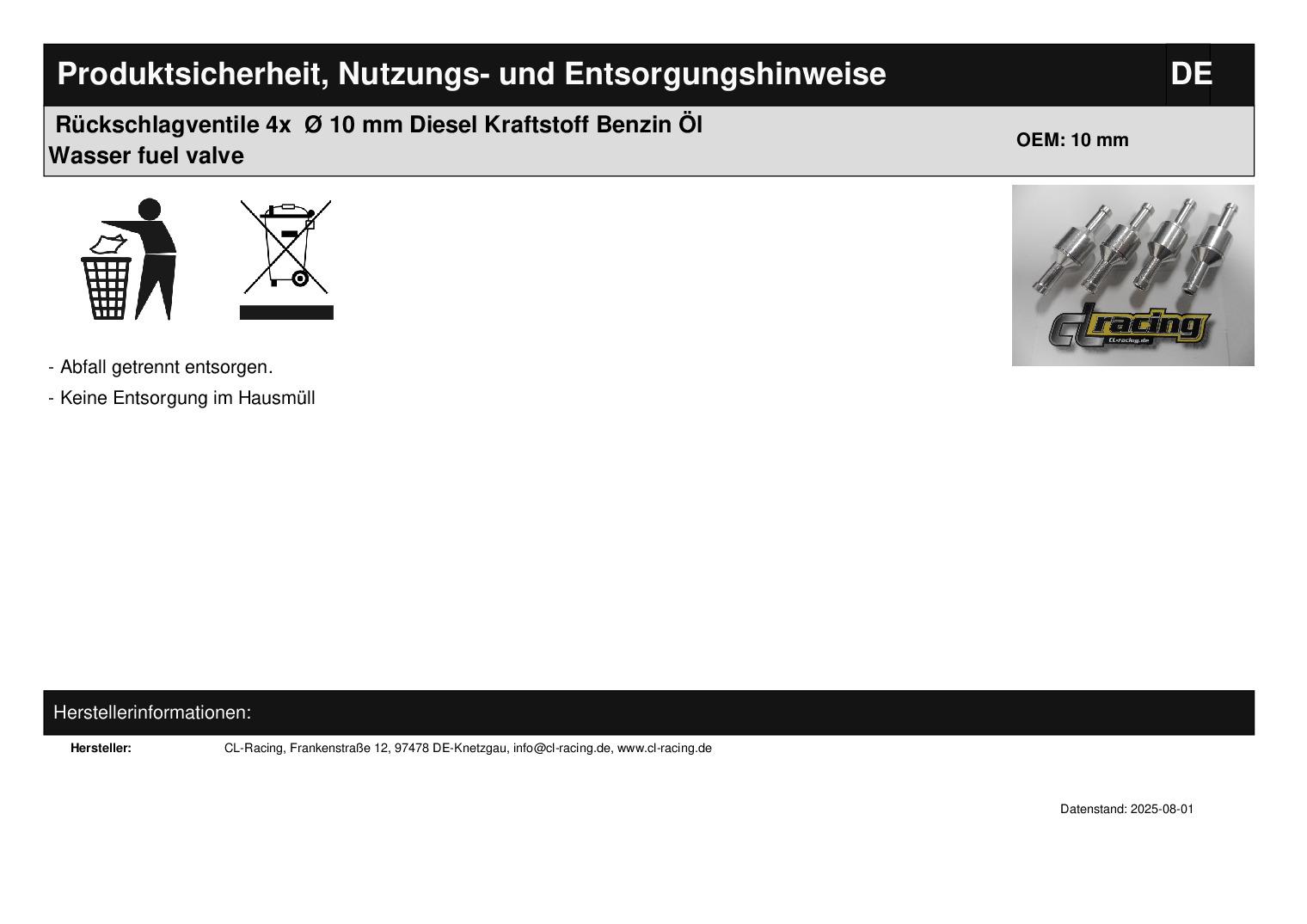 In dieser Auktion gibt es folgenden Artikel zu kaufen: Rückschlagventile (ähnlich Foto) Artikelbeschreibung: verhindert den Rücklauf und Rückschlag von Flüssigkeiten, Fetten, Ölen, Benzin oder Gas technische Daten: Maße: Gesamtlä nge: 50 mm Anschlusslä nge: ca. 15 mm Anschlussdurchmesser: Ø 10 mm Arbeitsbereich: 0 - 5 bar Öffnungsdruck: 0,2 bar Lieferumfang: 4 Stück Artikelzustand: neu Bei Unklarheiten oder Fragen bitte erst E-Mail schreiben.