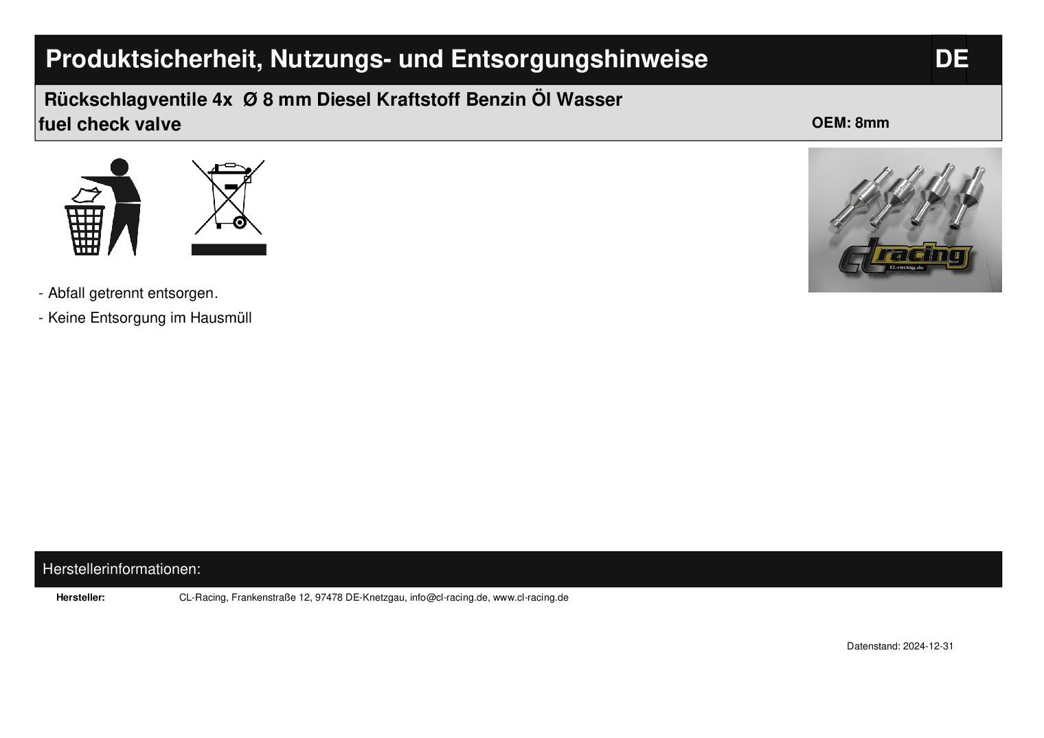 In dieser Auktion gibt es folgenden Artikel zu kaufen: Rückschlagventile (ähnlich Foto) Artikelbeschreibung: verhindert den Rücklauf und Rückschlag von Flüssigkeiten, Fetten, Ölen, Benzin oder Gas Maße: Gesamtlä nge: 50 mm Anschlusslä nge: ca. 15 mm Anschlussdurchmesser: 8 mm Arbeitsbereich: 0 - 5 bar Öffnungsdruck: 0,2 bar Lieferumfang: 4 Stück Artikelzustand: neu Bei Unklarheiten oder Fragen bitte erst E-Mail schreiben.