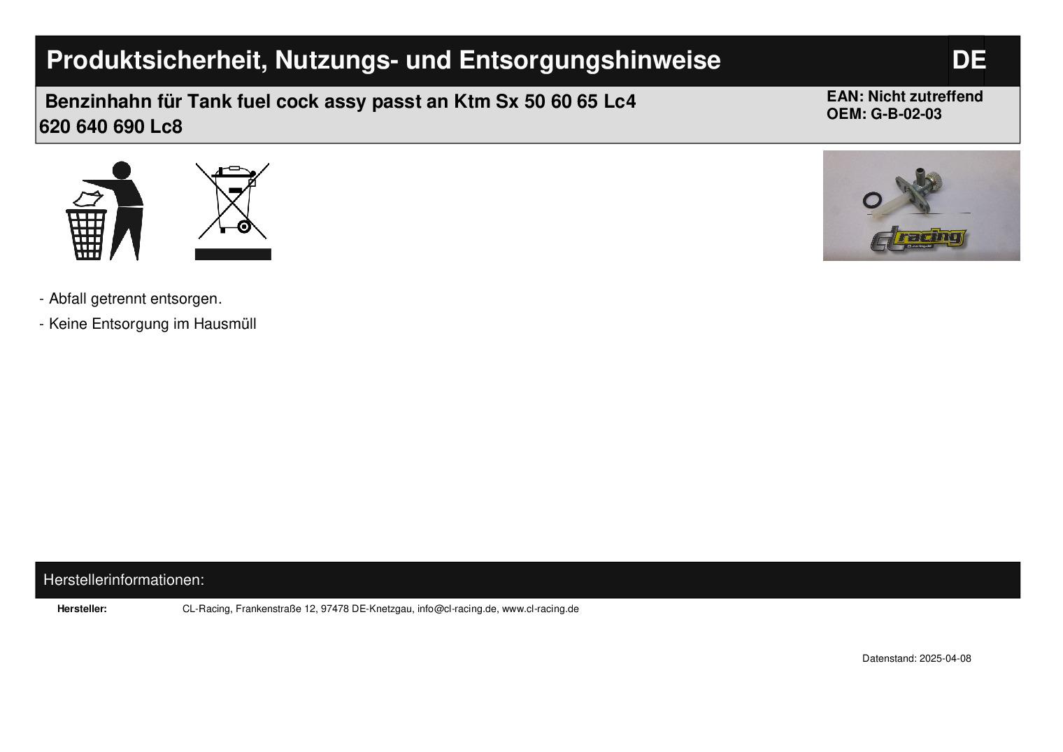 In dieser Auktion gibt es folgenden Artikel zu kaufen: Benzinhahn (ähnlich Foto) Modell: passend für Ktm SX 50, 60, 65 (2-Takt) LC8 950 990 1050 1190 1290 Adventure Super Adventure (4-Takt) LC8 990 1290 Super Duke (4-Takt) LC8 950 990 Supermoto SM-T SMR (4-Takt) LC8 950 Super Enduro (4-Takt) LC4 620 640 Adventure (4-Takt) LC4 690 Duke, Supermoto (4-Takt) passend für Husqvarna TC 50, 65 (2-Takt) Details: - Benzinhahn kann auf On, Off gestellt werden Bohrungsabstand: ca. 34 mm (Mitte Bohrung) Lieferumfang: siehe Foto Artikelzustand: neu Es handelt sich hierbei um kein Originalteil! Bei Unklarheiten oder Fragen bitte erst E-Mail schreiben.