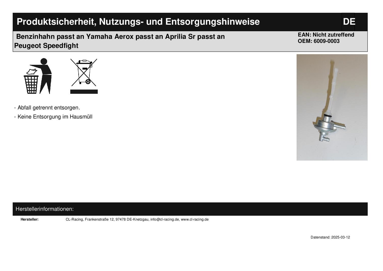 In dieser Auktion gibt es folgenden Artikel zu kaufen: Benzinhahn aus dem Zubehör (siehe Foto) Modell: passend für Aprilia Area 51 LC, Gulliver, Rally, Scarabeo, Sonic, SR, GileraEasy Moving AC, ICE AC, Stalker AC, Storm AC, TPH X AC, Typhoon AC Bj.: --- passend für ATU Calypso 125 Bj.: --- passend für Benelli 491 Bj.: --- passend für Beta Ark, Eikon Bj.: --- passend für Derbi Hunter, Vamos Bj.: --- passend für Gilera Stalker, Storm Bj.: --- passend für Italjet Formula, Jack, Jet-Set, Torpedo Bj.: --- passend für KTM Ark Bj.: --- passend für Kymco Agility, Heroism, Movie, Vivio, Curio CX/CX Super AC, DJY AC, K12 A, Top Boy AC, Vitality AC (2-Takter), ZX Fever II AC Bj.: --- passend für Malaguti Crosser, F12, F15, Yesterday Bj.: --- passend für MBK Booster NG AC, Booster Rocket AC, Track AC, Equalis AC, Evolis AC, Fizz AC, Flipper AC, Forte AC, Hot Champ, Mach G, Niltro, Ovetto AC, Sorriso AC, Stunt AC, Target AC, MegalutCentro AC (2-Takter), Crosser CR1 AC, F12 Phantom LC, F12R Phantom LC, F15 Firefox LC Bj.: --- passend für Piaggio Diesis AC, Fly AC (2-Takter), Free AC, Liberty AC (2-Takter), NRG, NRG mc² LC, NRG mc³, NRG Power DD LC, NRG Power DT AC, NRG extreme, NTT, Quartz, Sfera, SKR, Storm AC, TPH AC, Typhoon X AC, ZIP Base, ZIP SSL Bj.: --- passend für Peugeot Elyseo, Ludix, Jetforce, Speedfight 1 + 2 Bj.: --- passend für REX Escape AC (2-Takter), Rex AC (2-Takter), Rexy AC (2-Takter), Silverstreet AC (2-Takter) Bj.: --- passend für Rieju RS NKD, RS Sport Bj.: --- passend für Yamaha Aerox, Axis AC, BW`s AC, Breeze AC, Jog AC, Jog R AC, Jog RR AC, Neo`s AC, Slider AC, Why AC, Zest AC, Zumba AC, Zuma II AC Bj.: --- Anschluss: 6 mm Lieferumfang: siehe Foto Artikelzustand: neu Bei Unklarheiten oder Fragen bitte erst E-Mail schreiben.
