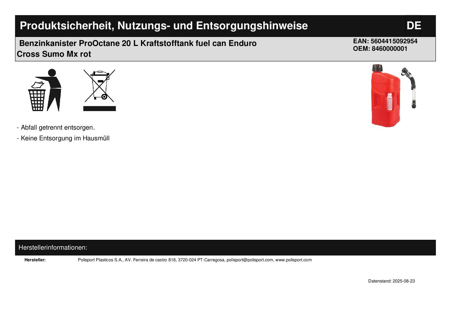 Titel: Benzinkanister ProOctane 20 L Kraftstofftank fuel can Enduro Cross Sumo Mx rot