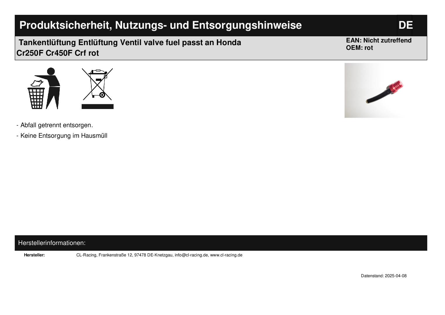 Titel: Tankentlüftung Entlüftung Ventil valve fuel passt an Honda Cr250F Cr450F Crf rot