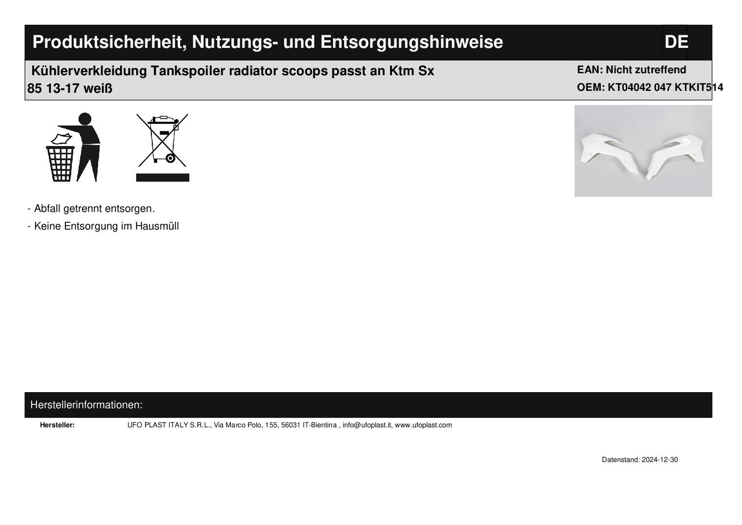 Titel: Kühlerverkleidung Tankspoiler radiator scoops passt an Ktm Sx 85 13-17 weiß