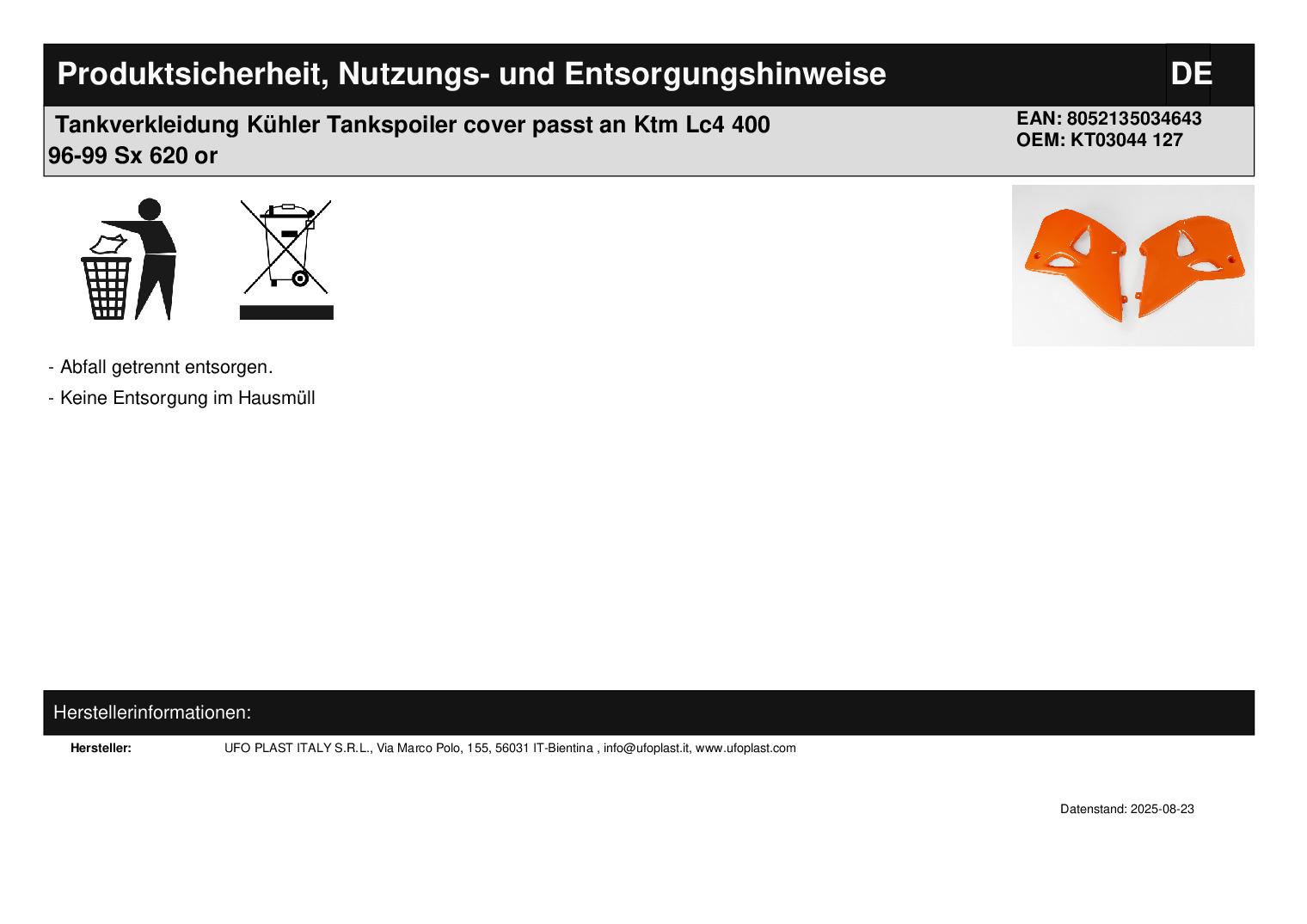 In dieser Auktion gibt es folgenden Artikel zu kaufen: Tankverkleidung (siehe Foto) Modell: passend für Ktm Lc4 400 Bj.: 96 - 99 Lc4 620 Bj.: 96 - 98 SX 400 Bj.: 98 - 99 SX 620 Bj.: 96 -98 Lieferumfang: siehe Foto Artikelzustand: neu