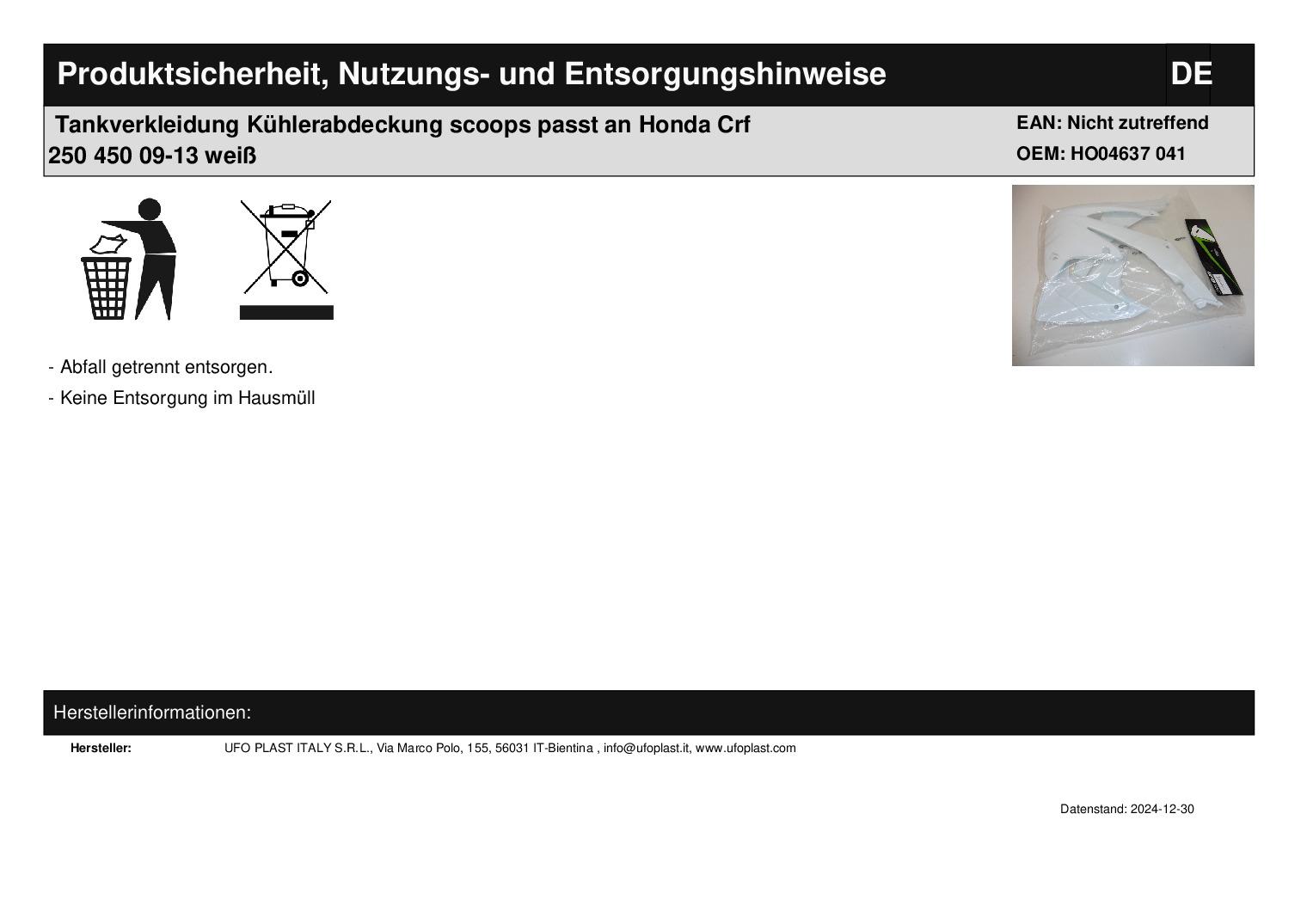 Titel: Tankverkleidung Kühlerabdeckung scoops passt an Honda Crf 250 450 09-13 weiß