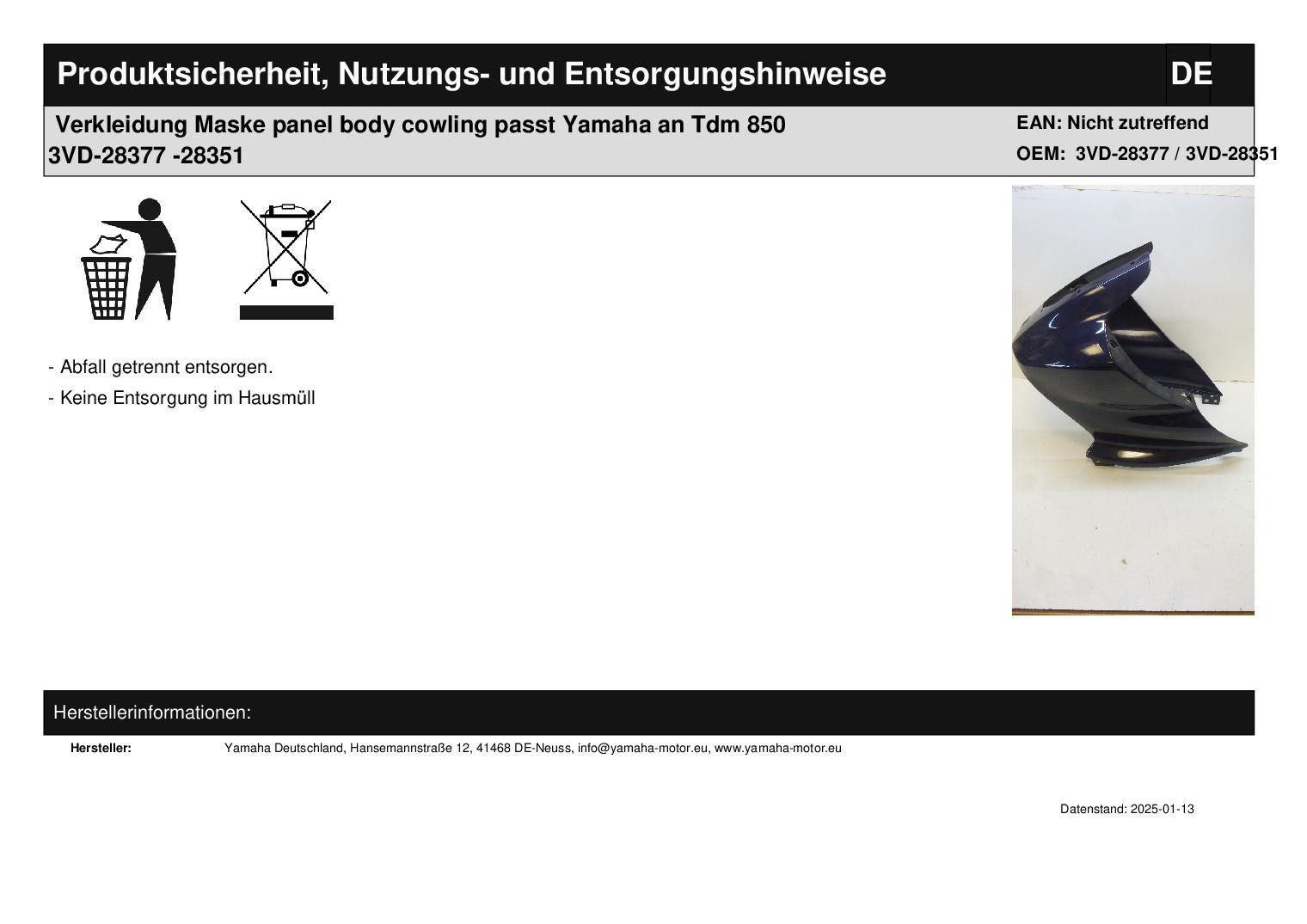 Titel: Verkleidung Maske panel body cowling passt Yamaha an Tdm 850 3VD-28377 -28351