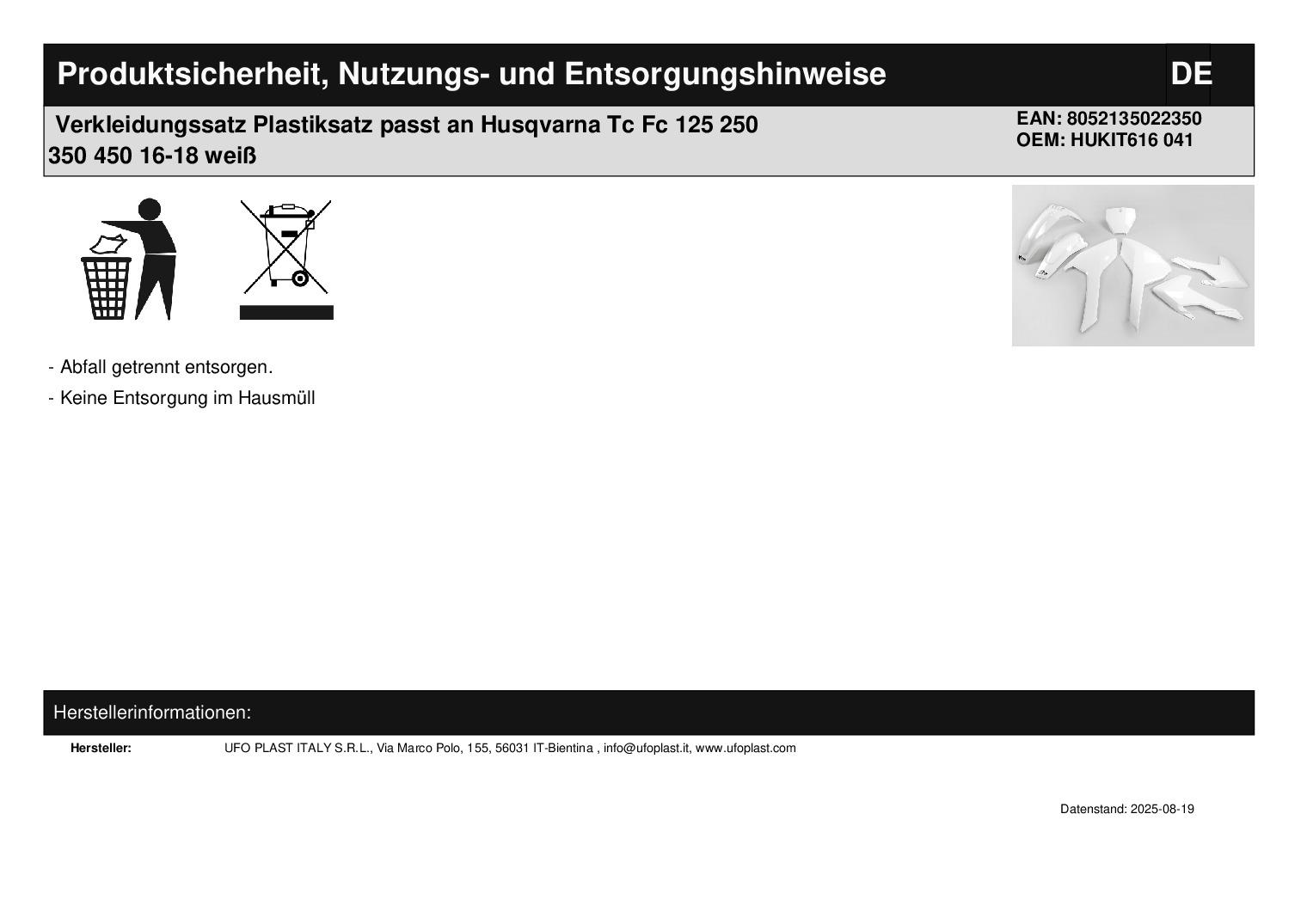 In dieser Auktion gibt es folgenden Artikel zu kaufen: Verkleidungssatz (ähnlich Foto) Modell: passend für Husqvarna TC 125 Bj.: 2016 - 2018 TC 250 Bj.: 2017 - 2018 FC 250 Bj.: 2016 - 2018 TC 300 Bj.: 2016 - 2018 FC 350 Bj.: 2016 - 2018 FC 450 Bj.: 2016 - 2018 Lieferumfang: siehe Foto Artikelzustand: neu Hierbei handelt es sich um kein Originalteil! Bei Unklarheiten oder Fragen bitte erst E-Mail schreiben.