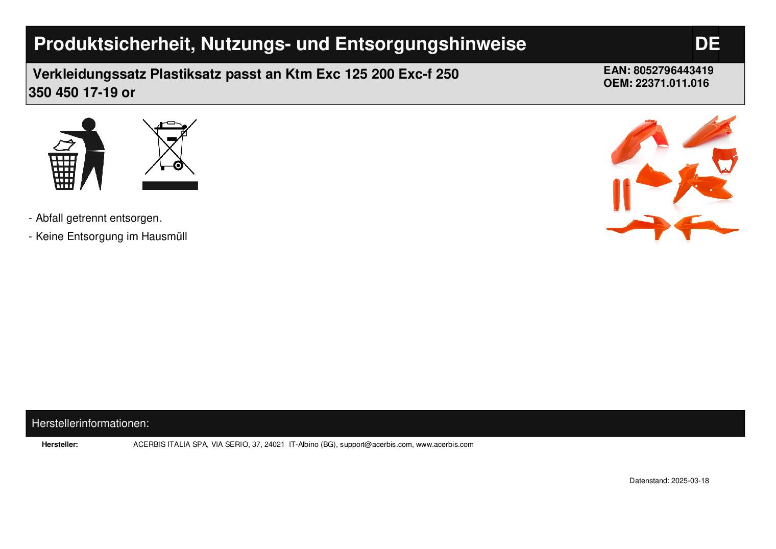 In dieser Auktion gibt es folgenden Artikel zu kaufen: Verkleidungssatz (ähnlich Foto) Modell: passend für Ktm EXC 125 Bj.: 2017 - 2019 EXC 200 Bj.: 2017 - 2019 EXC 250 Bj.: 2017 EXC 300 Bj.: 2017 EXC TPI 250 Bj.: 2018 - 2019 EXC TPI 300 Bj.: 2018 - 2019 EXC-F 250 Bj.: 2017 - 2019 EXC-F 350 Bj.: 2017 - 2019 EXC-F 450 Bj.: 2017 - 2019 EXC 500 Bj.: 2017 - 2019 Lieferumfang: Tankverkleidung links + rechts Heckverkleidung links + rechts Gabelprotektoren links + rechts Schutzblech vorne Schutzblech hinten Luftfilterkastenabdeckung Artikelzustand: neu Es handelt sich hierbei um kein Originalteil Bei Unklarheiten oder Fragen bitte erst E-Mail schreiben.