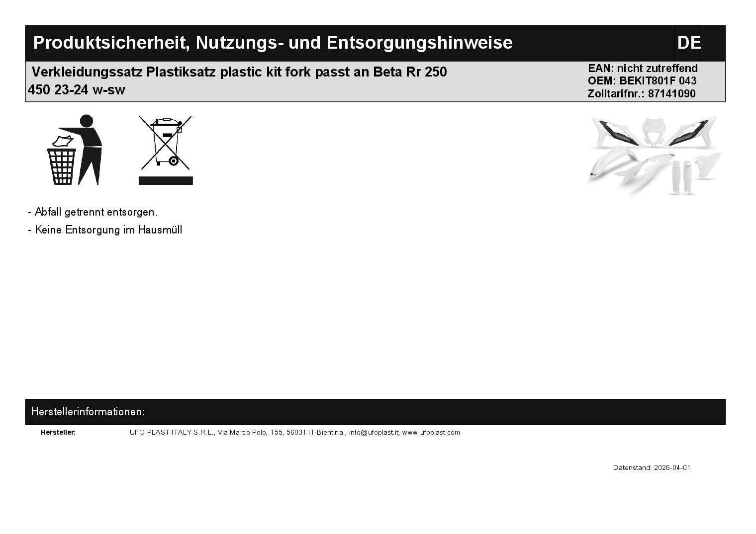 • Verkleidungssatz Plastiksatz plastic kit fork passt an Beta Rr 250 450 23-24 w-sw