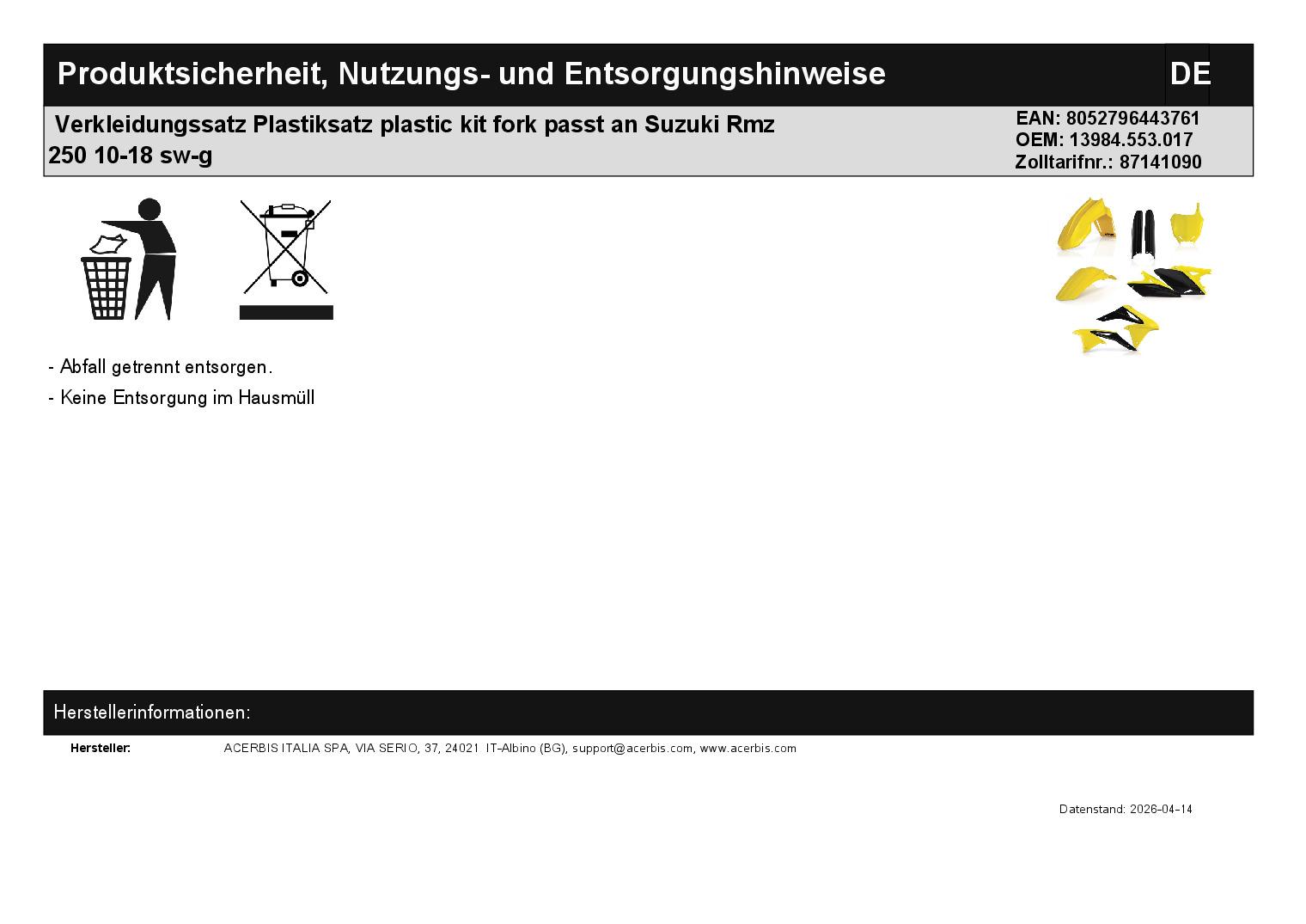 Titel: Verkleidungssatz Plastiksatz plastic kit fork passt an Suzuki Rmz 250 10-18 sw-g