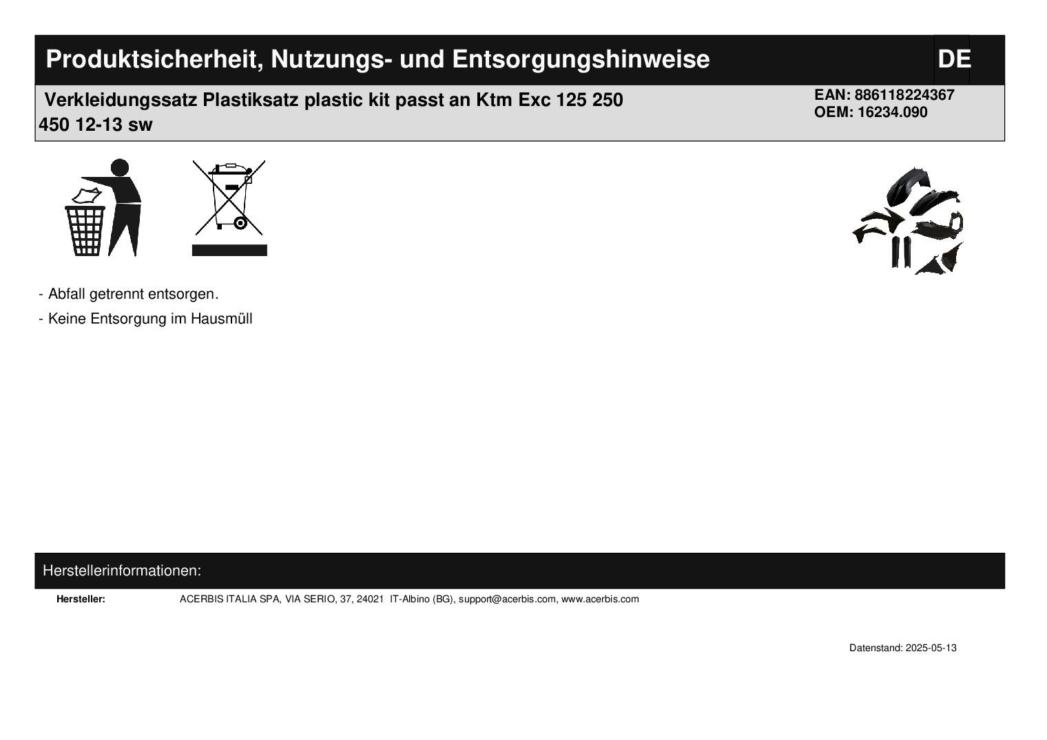 In dieser Auktion gibt es folgenden Artikel zu kaufen: Verkleidungssatz (siehe Foto) Fahrzeug: passend für Ktm Exc 125, 200, 250, 300 Bj.: 2012 - 2013 (2-Takt) Exc-f 250, 350, 450, 500 Bj.: 2012 - 2013 (4-Takt) Lieferumfang: Tankverkleidung Seitenverkleidung Schutzblech vorne Schutzblech hinten Gabelprotektoren Luftfilterkasten Luftfilterkastenabdeckung Artikelzustand: neu Es handelt sich hierbei um kein Originalteil Bei Unklarheiten oder Fragen bitte erst E-Mail schreiben.