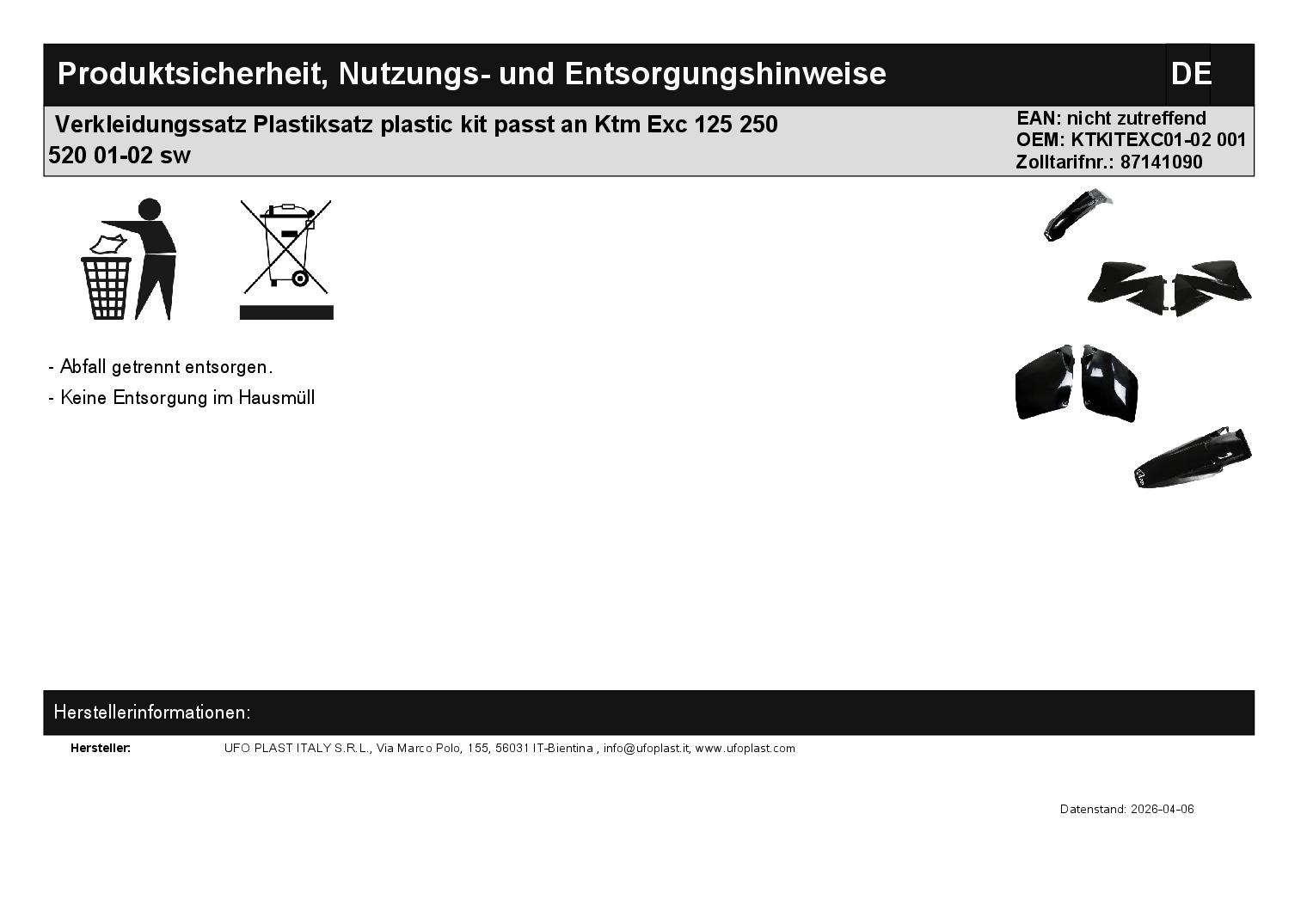 In dieser Auktion gibt es folgenden Artikel zu kaufen: Verkleidungssatz (siehe Foto) Fahrzeug: passend für Ktm EXC 125 Bj.: 2001 - 2002 EXC 200 Bj.: 2001 - 2002 EXC 250 Bj.: 2001 - 2002 EXC 300 Bj.: 2001 - 2002 EXC 380 Bj.: 2001 - 2002 EXC 400 Bj.: 2001 - 2002 EXC 520 Bj.: 2001 - 2002 Lieferumfang: siehe Foto Artikelzustand: neu Es handelt sich hierbei um kein Originalteil! Bei Unklarheiten oder Fragen bitte erst E-Mail schreiben.