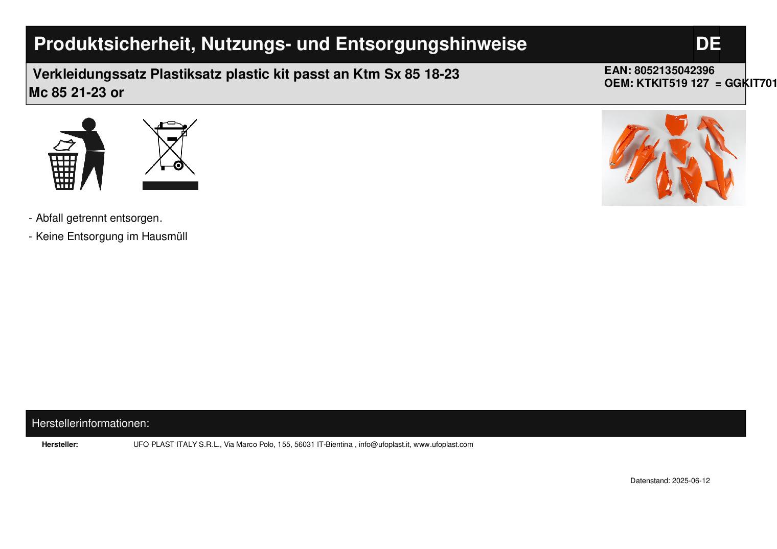 • Verkleidungssatz Plastiksatz plastic kit passt an Ktm Sx 85 18-24 Mc 85 21-24 or