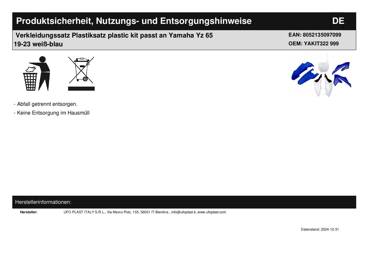 Titel: Verkleidungssatz Plastiksatz plastic kit passt an Yamaha Yz 65 19-25 weiß-blau