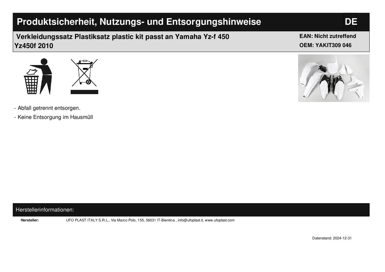 In dieser Auktion gibt es folgenden Artikel zu kaufen: Verkleidungssatz (ähnlich Foto) Fahrzeug: passend für Yamaha Yz-f 450 Bj.: 2010 (4-Takt) Lieferumfang: siehe Foto Artikelzustand: neu aus Geschäftsauflösung, mit minimalen Lagerspuren; Zustand siehe Foto Hierbei handelt es sich um kein Originalteil! Bei Unklarheiten oder Fragen bitte erst E-Mail schreiben.