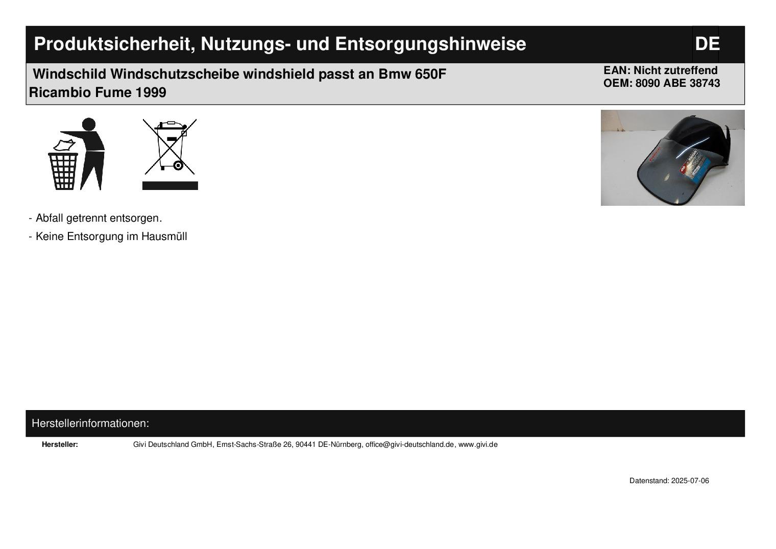 In dieser Auktion gibt es folgenden Artikel zu kaufen: Windschild (siehe Foto) Modell: passend für BMW 650F Ricambion Fume Bj.: 1999 Artikelbeschreibung: - produziert aus Antishock-Material - ABE vorhanden Größe: in der Mitte ca. 45 cm hoch Breite gesamt ca. 42 cm Lieferumfang: siehe Foto Artikelzustand: neu aus Geschäftsauflösung, mit minimalen Lagerspuren wie leichte Kratzer; Zustand siehe Foto Bei Unklarheiten oder Fragen bitte erst E-Mail schreiben.