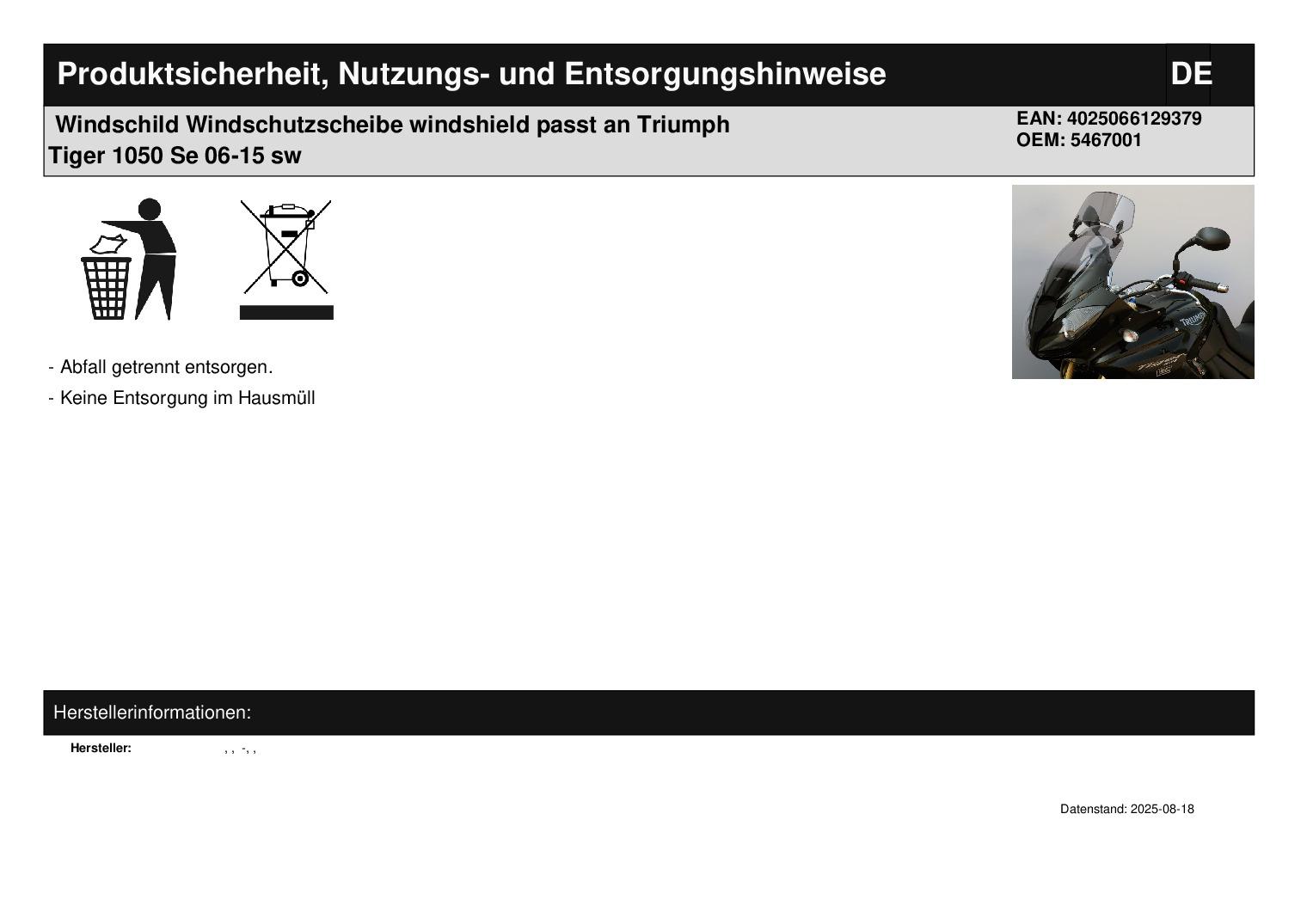 Tiger 1050 SE Bj.: 06 - 15 Lieferumfang: siehe Foto Artikelzustand: neu aus Geschäftsauflösung, mit leichten Lagerspuren; Zustand siehe Foto Bei Unklarheiten oder Fragen bitte erst E-Mail schreiben.
