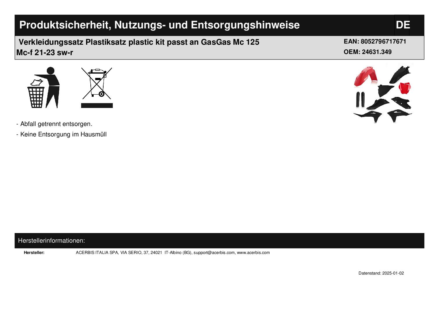 Schutzblech vorne Schutzblech hinten Tankverkleidung links und rechts Seitenverkleidung links und rechts mit Luftfilterkastendeckel links Startnummerntafel Artikelzustand: neu Bei Unklarheiten oder Fragen bitte erst E-Mail schreiben.