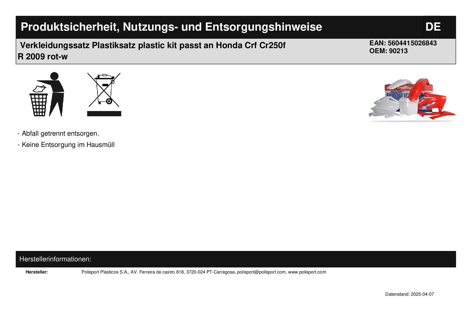 In dieser Auktion gibt es folgenden Artikel zu kaufen: Verkleidungssatz (ähnlich Foto) Modell: passend für Honda CRF 250 R Bj.: 2009 Lieferumfang: Schutzblech vorne Schutzblech hinten Tankverkleidung Seitenverkleidung Startnummerntafel Artikelzustand: neu Bei Unklarheiten oder Fragen bitte erst E-Mail schreiben.