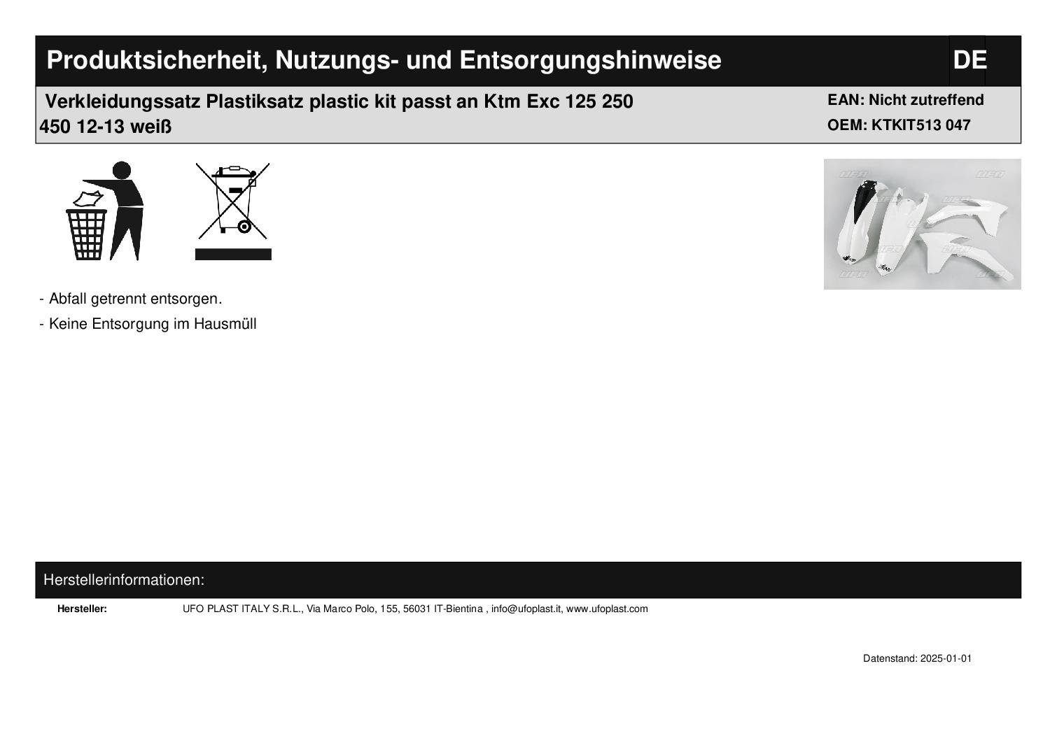 In dieser Auktion gibt es folgenden Artikel zu kaufen: Verkleidungssatz (ähnlich Foto) Fahrzeug: passend für Ktm Exc 125 Bj.: 2012 - 2013 (2-Takt) Exc 200 Bj.: 2012 - 2013 (2-Takt) Exc 250 Bj.: 2012 - 2013 (2-Takt) Exc-f 250 Bj.: 2012 - 2013 (4-Takt) Exc-f 300 Bj.: 2012 - 2013 (4-Takt) Exc-f 450 Bj.: 2012 - 2013 (4-Takt) Exc-f 500 Bj.: 2012 - 2013 (4-Takt) Lieferumfang: Tankverkleidung links + rechts Schutzblech vorne Schutzblech hinten Artikelzustand: neu aus Geschäftsauflösung, mit minimalen Lagerspuren; Zustand ähnlich Foto Bei Unklarheiten oder Fragen bitte erst E-Mail schreiben.
