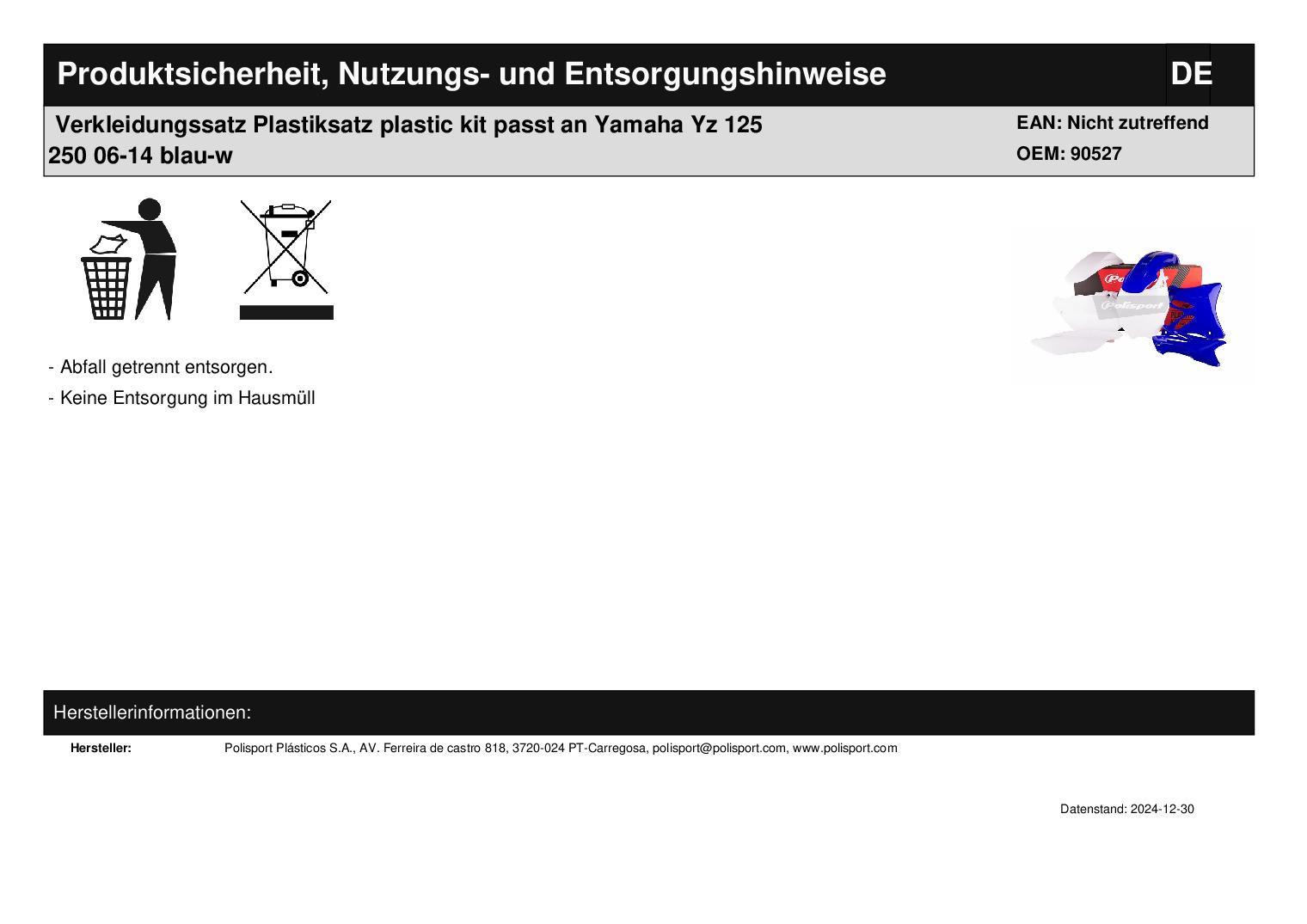 In dieser Auktion gibt es folgenden Artikel zu kaufen: Verkleidungssatz (siehe Foto) Modell: passend für Yamaha YZ 125 Bj.: 2006 - 2014 (2-Takt) YZ 250 Bj.: 2006 - 2014 (2-Takt) Lieferumfang: Tankverkleidung Seitenverkleidung Startnummerntafel Schutzblech vorne Schutzblech hinten Artikelzustand: neu aus Geschäftsauflösung, mit leichten Lagerspuren; Zustand siehe Foto