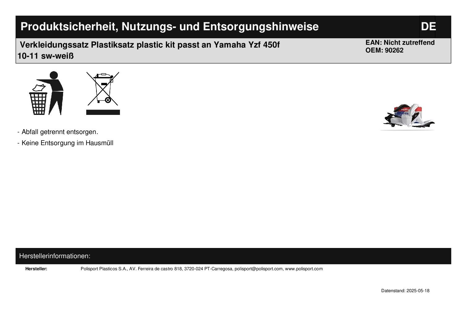 In dieser Auktion gibt es folgenden Artikel zu kaufen: Verkleidungssatz (ähnlich Foto) Modell: passend für Yamaha YZF 450 Bj.: 10 - 11 Lieferumfang: Schutzblech vorne Schutzblech hinten SeitenverkleidungTankverkleidung Startnummerntafel Artikelzustand: neu Bei Unklarheiten oder Fragen bitte erst E-Mail schreiben.