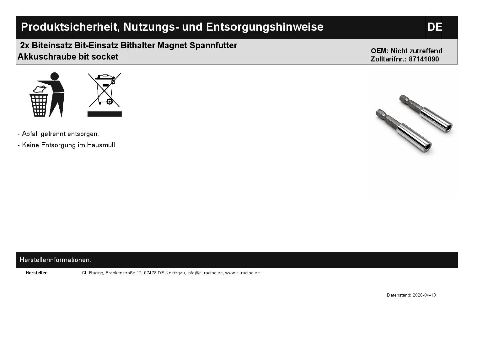 In dieser Auktion gibt es folgenden Artikel zu kaufen: Magnet-Biteinsätze (ähnlich Foto) Artikelbeschreibung: Gesamtlänge: 61 mm Außendurchmesser: Ø 9,7 mm 6-Kant-Aufnahme: 6,3 mm Lieferumfang: 2 Stück Artikelzustand: neu Bei Unklarheiten oder Fragen bitte erst E-Mail schreiben.