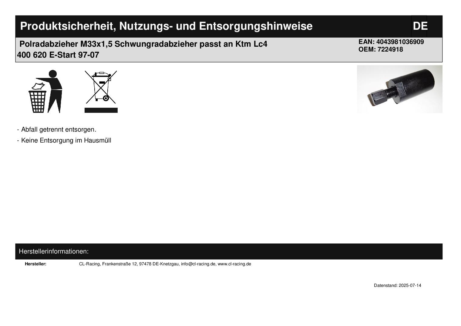 In dieser Auktion gibt es folgenden Artikel zu kaufen: Polradabzieher (siehe Foto) Modell: passend für Ktm Lc4 mit E-Start 400 620 640 660 Adventure Enduro Supermoto Bj.: 97 - 07 passend für diverse Suzuki-Modelle Bj.: unbekannt Gewinde: M33 x 1,5 Bitte Abmaße prüfen, da es unterschiedliche Ausführungen gibt!!! Lieferumfang: 1 Stück Artikelzustand: neu Es handelt sich hierbei um kein Originalteil Bei Unklarheiten oder Fragen bitte erst E-Mail schreiben.