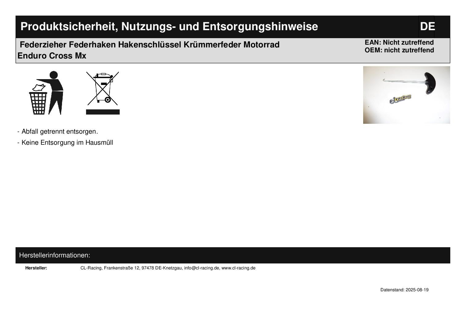 In dieser Auktion gibt es folgenden Artikel zu kaufen: Federzieher mit Kunststoffgriff (siehe Foto) Artikelbeschreibung: Werkzeug zum Montieren von Krümmer- oder Auspufffedern. Länge: 17,5 cm Lieferumfang: 1 Stück Artikelzustand: neu Bei Unklarheiten oder Fragen bitte erst E-Mail schreiben.