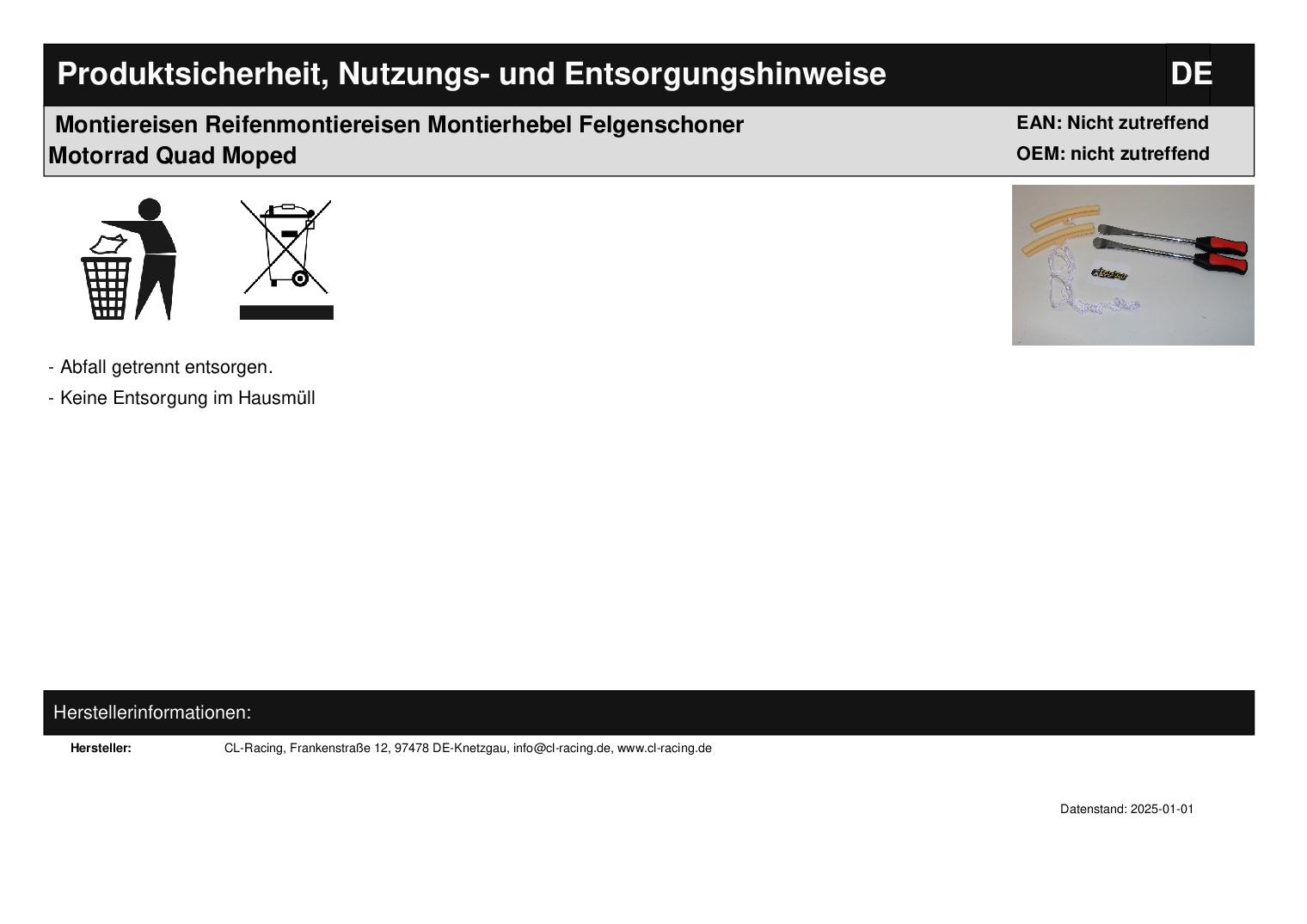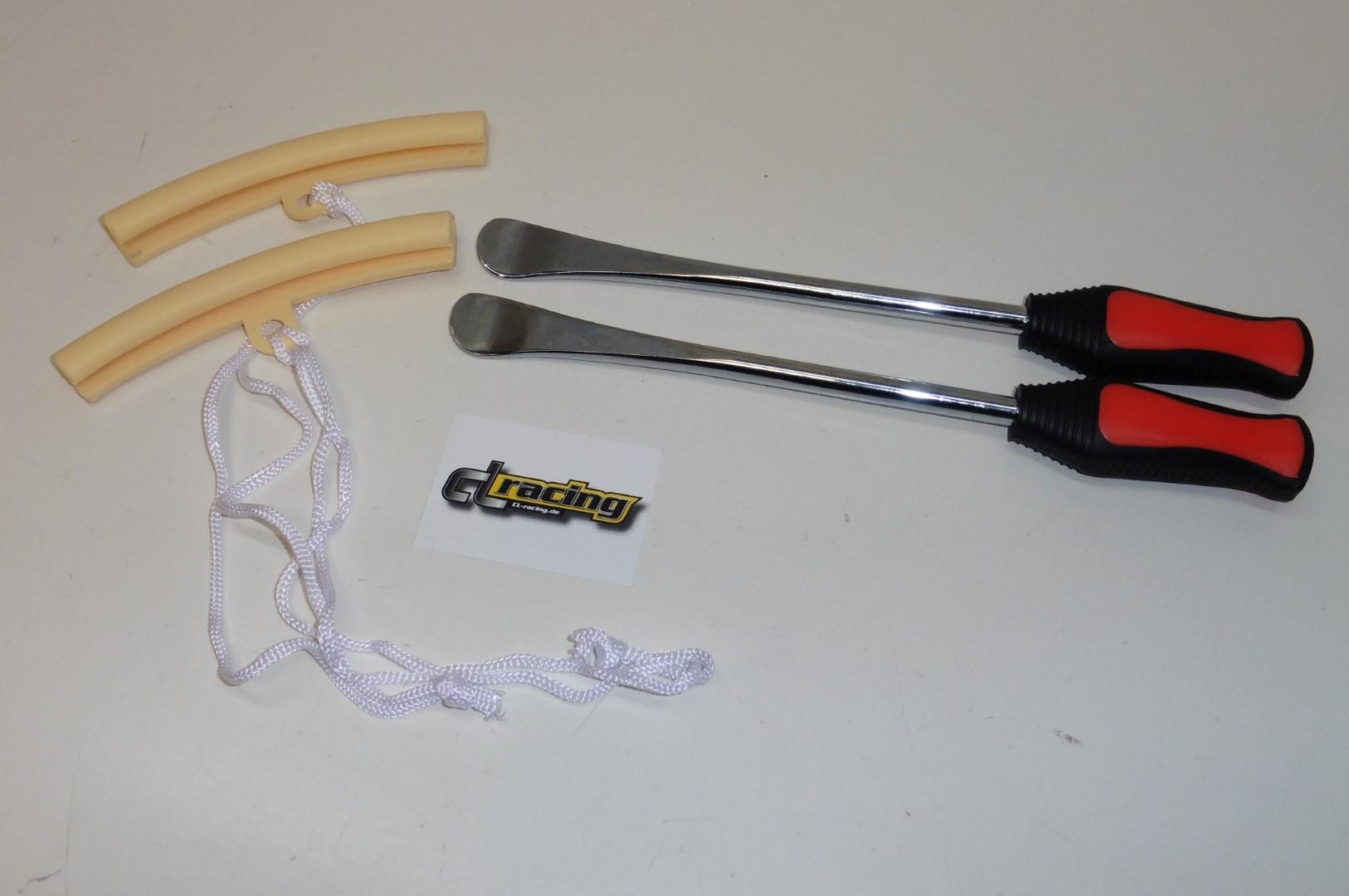 In dieser Auktion gibt es folgenden Artikel zu kaufen: Reifen-Montiereisen + Felgenschutz (siehe Foto) Artikelbeschreibung: ideal zum Montieren von Motorrad-, Moped-, Roller-, Fahrrad-, Quadreifen - formschöner Kunststoffgriff - Felgenschoner dienen, um bei der Montage des Reifens Beschädigungen der Felgen zu vermeiden Länge Montiereisen: ca. 30 cm Länge Felgenschoner: ca. 15 cm Lieferumfang: 2 x Montiereisen 2 x Felgenschutz Artikelzustand: neu Bei Unklarheiten oder Fragen bitte erst E-Mail schreiben.