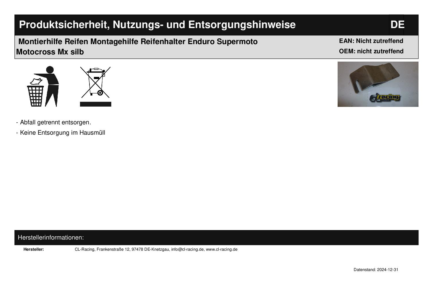 In dieser Auktion gibt es folgenden Artikel zu kaufen: Reifen-Montierhilfe (siehe Foto) Artikelbeschreibung: - wird zwischen Reifen und Felge geklemmt und hält den Reifen im Felgenbett - erleichtert die Reifenmontage - auch für Mousse geeignet Lieferumfang: 1 Stück Artikelzustand: neu Bei Unklarheiten oder Fragen bitte erst E-Mail schreiben.