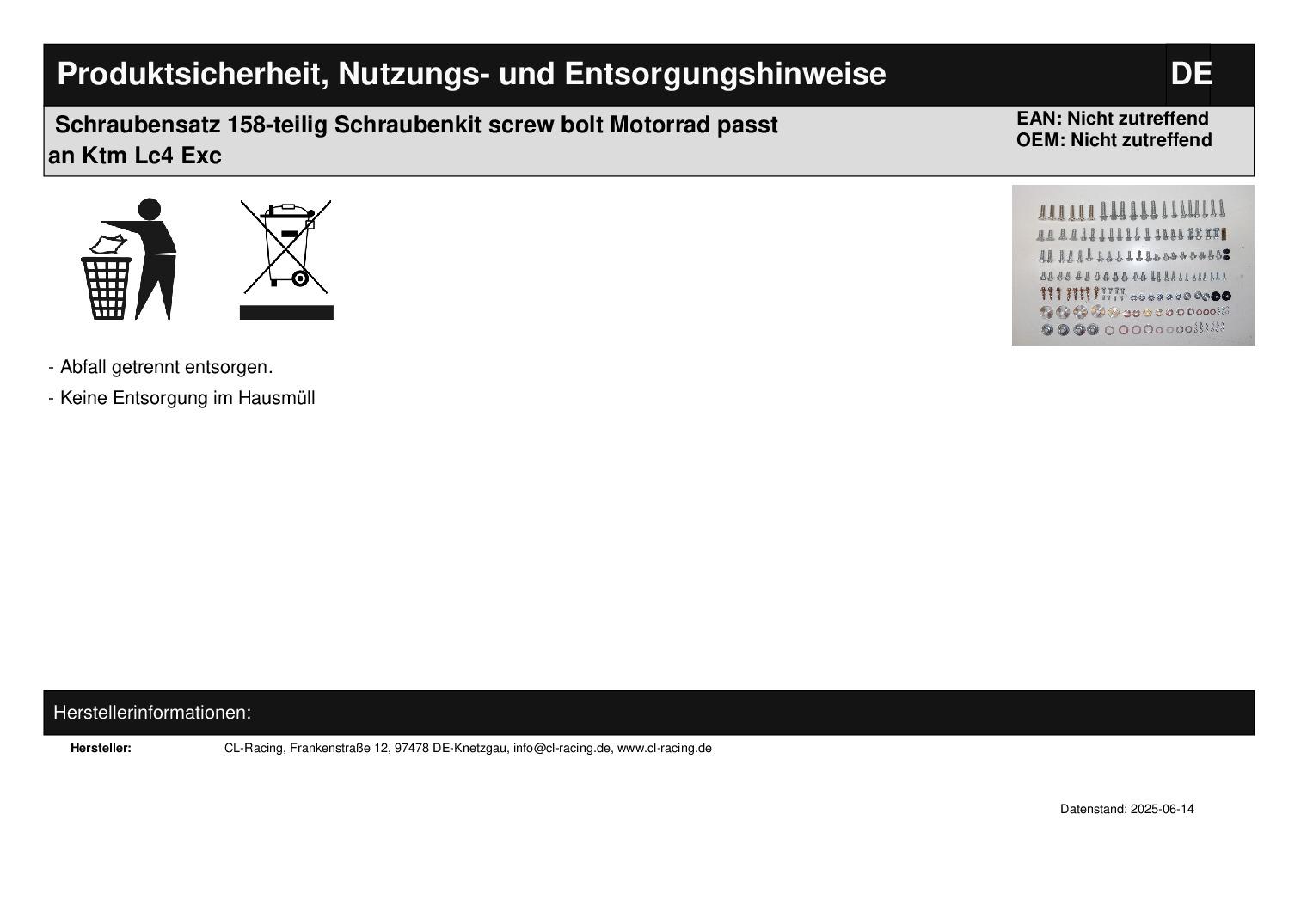 In dieser Auktion gibt es folgenden Artikel zu kaufen: 158-teiliger Schraubensatz in Top-Qualität (siehe Foto) Fahrzeug: passend für Ktm Bj.: --- passend für Husaberg Bj.: --- passend für Husqvarna Bj.: -- Lieferumfang: 158 Teile diverse Schrauben, Splinte, Scheiben usw.; alles in einer gut sortierten Kunststoffbox Artikelzustand: neu Es handelt sich hierbei um kein Originalteil Bei Unklarheiten oder Fragen bitte erst E-Mail schreiben.
