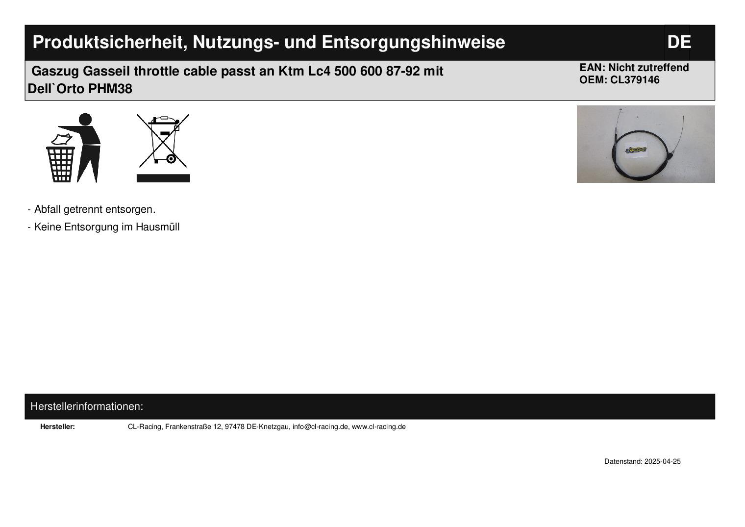 In dieser Auktion gibt es folgenden Artikel zu kaufen: Gaszug aus dem Zubehör (siehe Foto) Modell: passt an Ktm nur mit Dell`Orto PHM38 Vergaser LC4 500 Bj.: 1987 - 1992 LC4 600 Bj.: 1987 - 1992 Abmaße: Länge des Gaszugs gesamt: ca. 104 cm Länge der Ummantelung incl. der silbernen Anschlüsse: ca 82,5 cm Vergleichsnummer: 580.02.091.000 Lieferumfang: siehe Foto Artikelzustand: neu Hierbei handelt es sich um kein Originalteil Bei Unklarheiten oder Fragen bitte erst E-Mail schreiben.