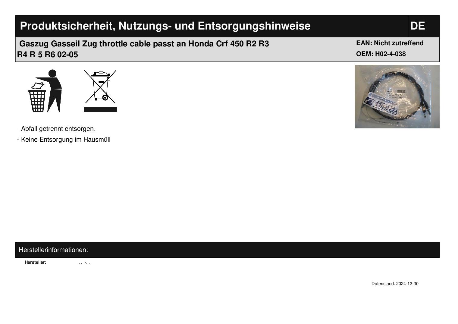 In dieser Auktion gibt es folgenden Artikel zu kaufen: Gaszug Öffner/Schließer (siehe Foto) Modell: passend für Honda CRF 450R R2 - R6 Bj.: 2002 - 2005 Vergleichsnummer: H02-4-038 Lieferumfang: siehe Foto Artikelzustand: neu aus Geschäftsauflösung, mit leichten Lagerspuren; Zustand siehe Foto Bei Unklarheiten oder Fragen bitte erst E-Mail schreiben.