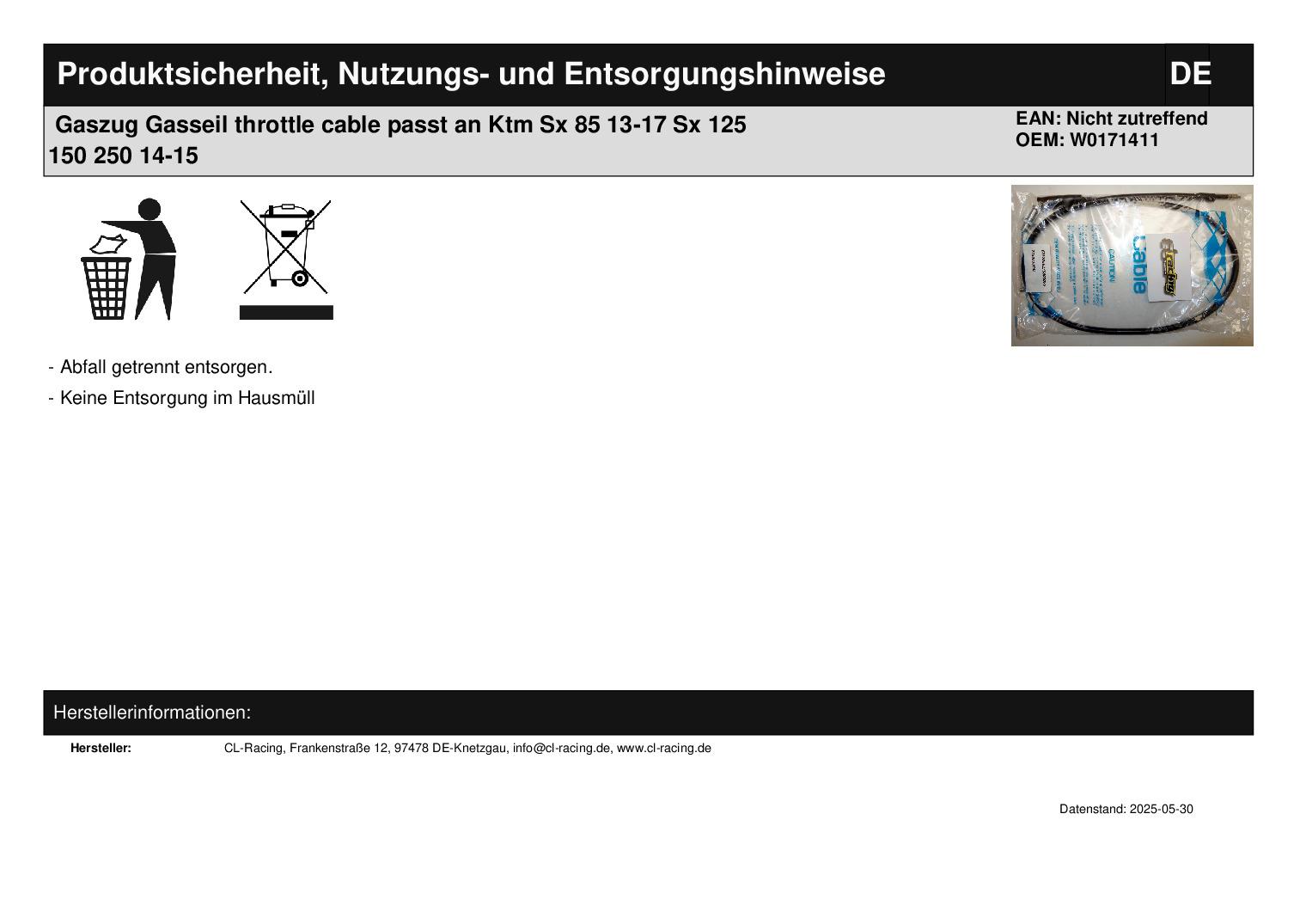 In dieser Auktion gibt es folgenden Artikel zu kaufen: Gaszug (siehe Foto) Modell: passend für KTM SX 85 Bj.: 13 - 17 SX 125, 150, 250 Bj.: 14 - 15 Lieferumfang: 1 Stück Artikelzustand: neu Hierbei handelt es sich um kein Originalteil Bei Unklarheiten oder Fragen bitte erst E-Mail schreiben.