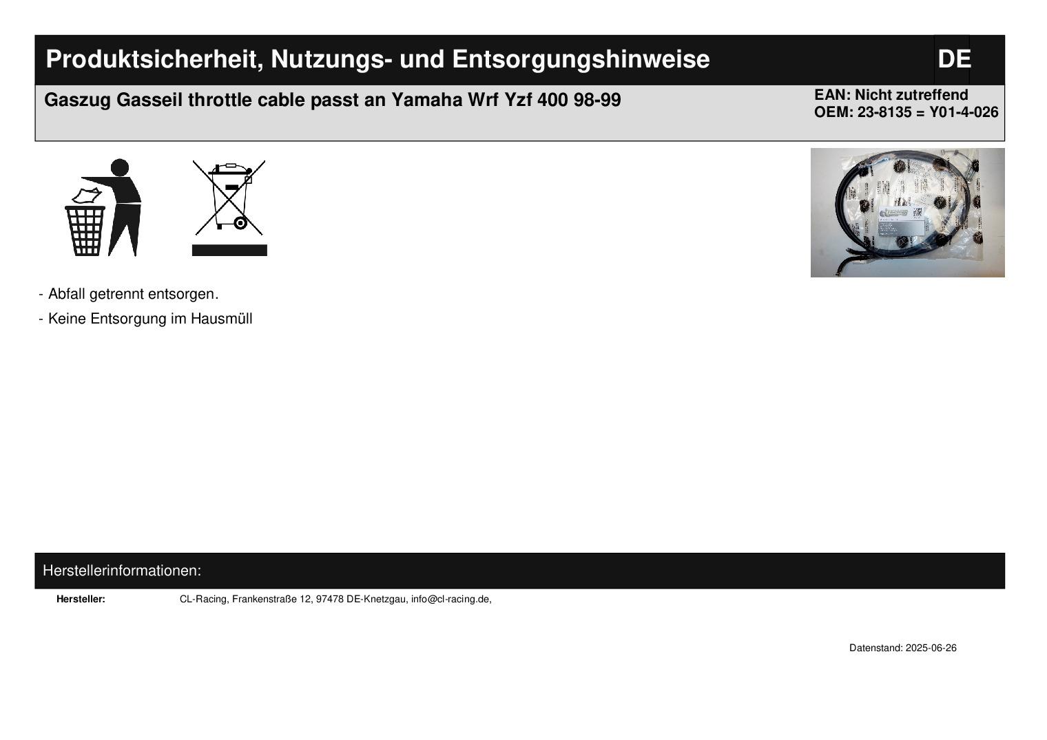 In dieser Auktion gibt es folgenden Artikel zu kaufen: Gaszug (siehe Foto) Modell: passend für Yamaha Yzf, Wrf 400 Bj.: 1998 - 1999 nur mit Magura 312T Gasgriff! Lieferumfang: 1 Stück Artikelzustand: neu Hierbei handelt es sich um kein Originalteil Bei Unklarheiten oder Fragen bitte erst E-Mail schreiben.