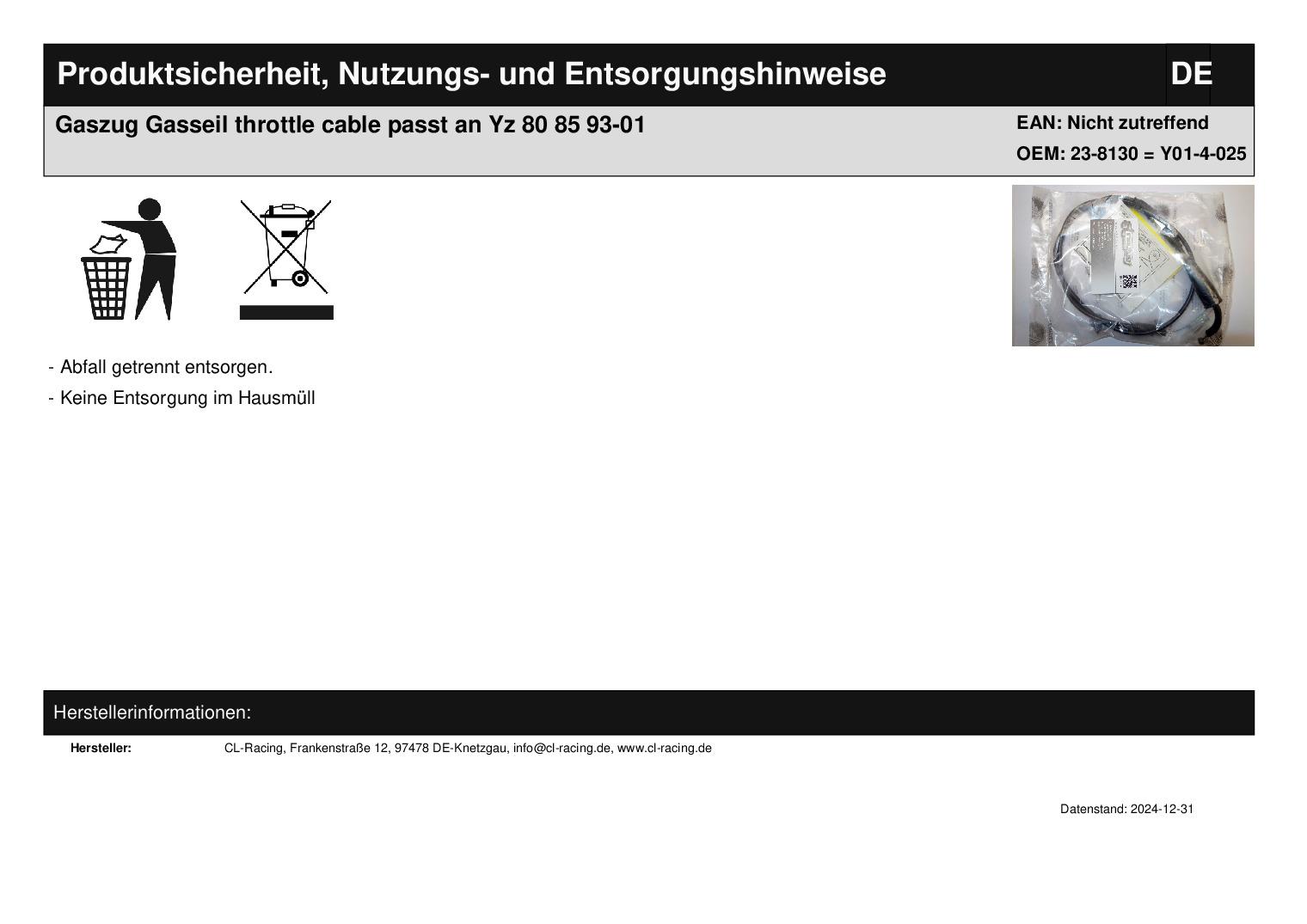 In dieser Auktion gibt es folgenden Artikel zu kaufen: Gaszug (siehe Foto) Modell: passend für Yamaha Yz 80, 85 Bj.: 1993 - 2001 Lieferumfang: 1 Stück Artikelzustand: neu Hierbei handelt es sich um kein Originalteil Bei Unklarheiten oder Fragen bitte erst E-Mail schreiben.