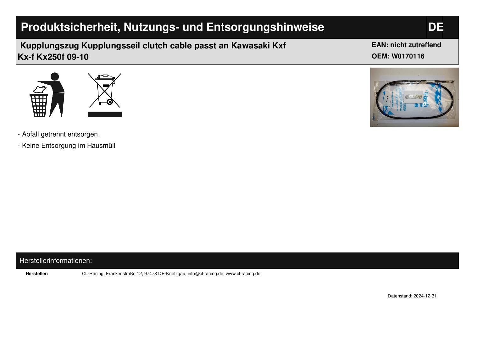 In dieser Auktion gibt es folgenden Artikel zu kaufen: Kupplungszug (siehe Foto) Modell: passend für Kawasaki Kxf 250 Bj.: 2009 - 2010 (4-Takt) Lieferumfang: siehe Foto Artikelzustand: neu aus Geschäftsauflösung, mit leichten Lagerspuren; Zustand siehe Foto Hierbei handelt es sich um kein Originalteil! Bei Unklarheiten oder Fragen bitte erst E-Mail schreiben.