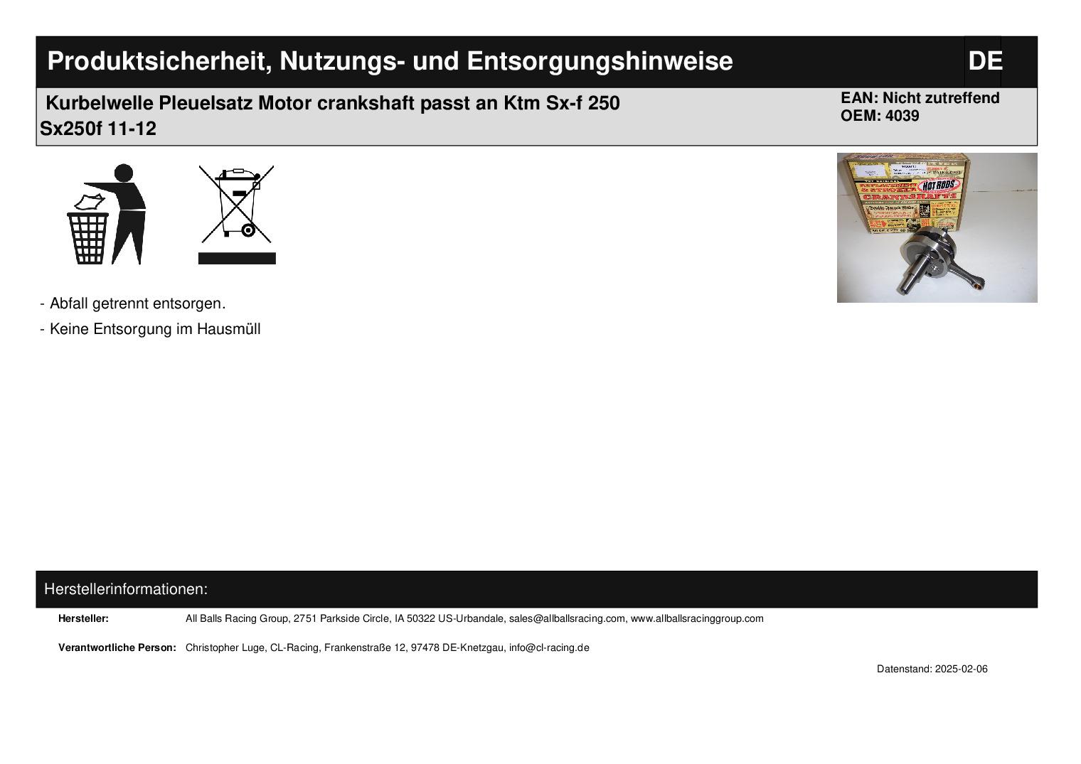 In dieser Auktion gibt es folgenden Artikel zu kaufen: Kurbelwelle (siehe Foto) Modell: passend für Ktm Sx-f 250 Bj.: 2011 - 2012 (4-Takt) Lieferumfang: siehe Foto Artikelzustand: neu, aus Geschäftsauflösung mit leichten Lagerspuren. Es handelt sich hierbei um kein Originalteil Bei Unklarheiten oder Fragen bitte erst E-Mail schreiben.
