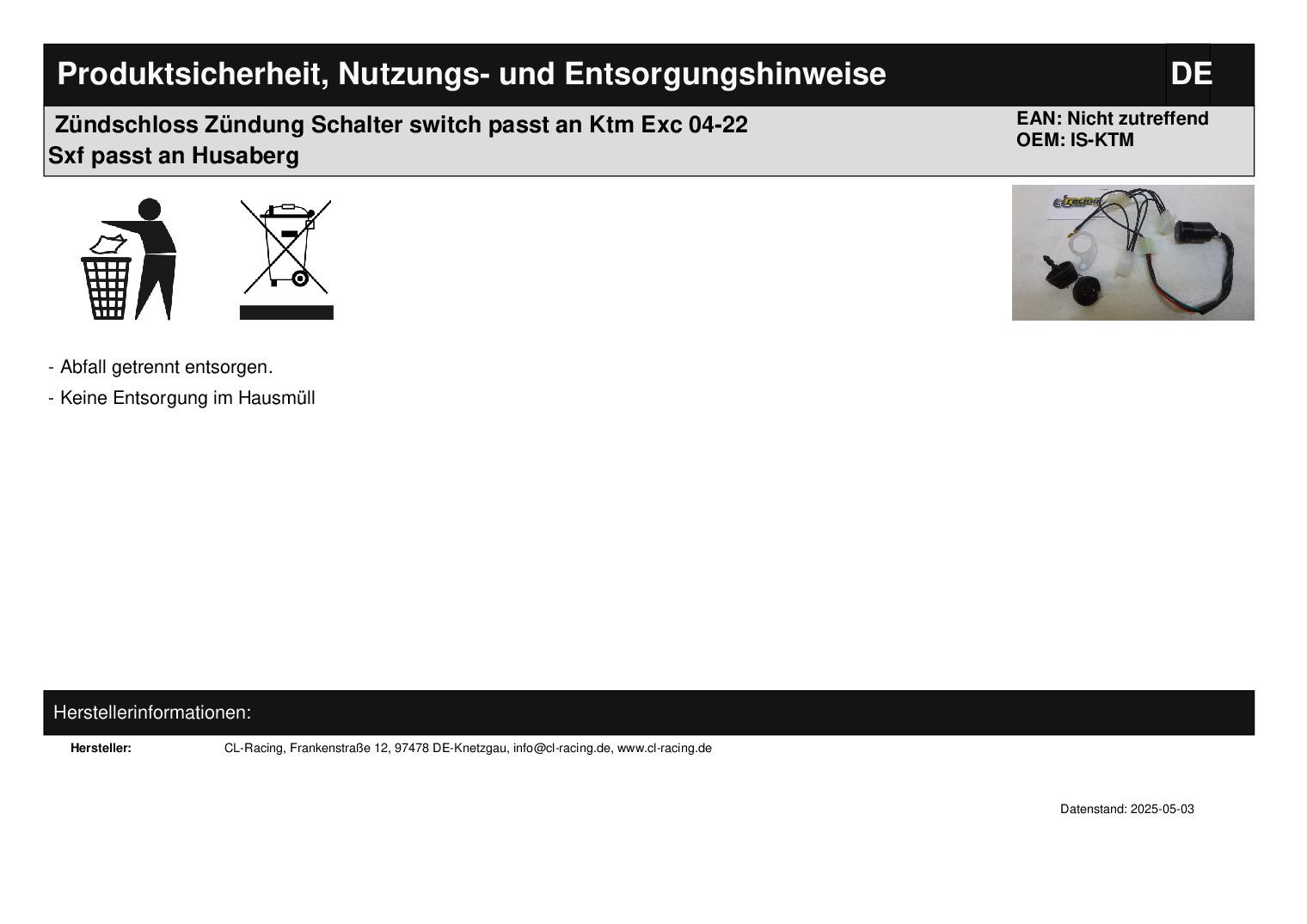 In dieser Auktion gibt es folgenden Artikel zu kaufen: Zündschloss mit Halterung (siehe Foto) Modell: passend für Ktm EXC, EXC-F alle Modelle Bj.: 04 - 22 SXF alle Modelle Bj.: 07 - 22 passend für Husaberg alle Modelle Bj.: 13 - 14 passend für Husqvarna FE, TE alle Modelle Bj.: 14 - 22 passend für GasGas EX/F alle Modelle Bj.: 21 - 22 Lieferumfang: 1 Stück Artikelzustand: neu Bei Unklarheiten oder Fragen bitte erst E-Mail schreiben.