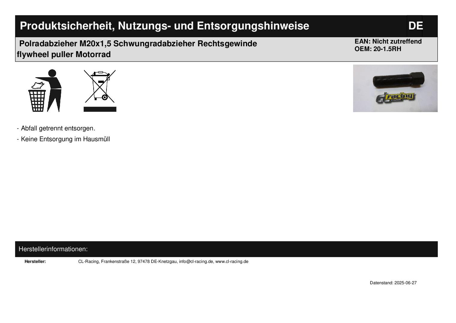 In dieser Auktion gibt es folgenden Artikel zu kaufen: Polradabzieher (siehe Foto) Gewinde: M20 x 1,5 RH (Rechtsgewinde) Bitte Gewinde prüfen, das es unterschiedliche Ausführungen gibt!!! Lieferumfang: siehe Foto Artikelzustand: neu Bei Unklarheiten oder Fragen bitte erst E-Mail schreiben.