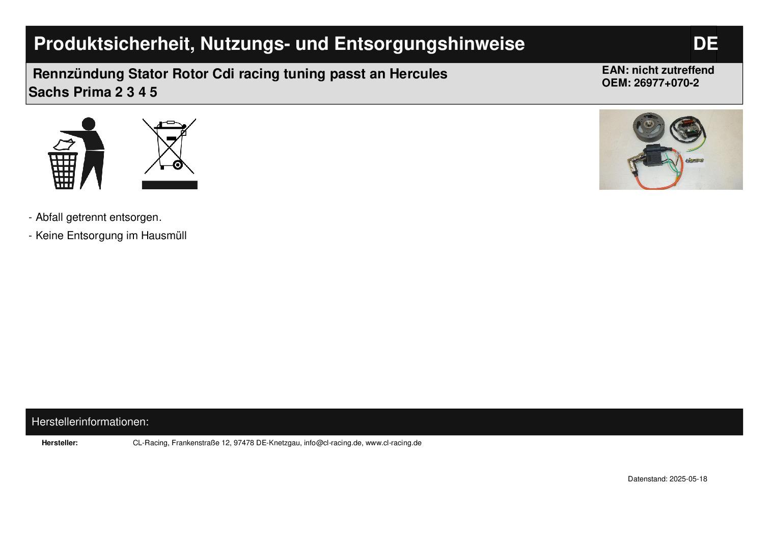 In dieser Auktion gibt es folgenden Artikel zu kaufen: Zündung 12V/35W aus dem Zubehör für 505 Motor (ähnlich Foto) Modell: passend für Sachs- Hercules-Mofa Artikelbeschreibung: elektronische, außen liegende Zündung ohne Unterbrecher Typ: Prima 2, 3, 4, 5 M 2, 3, 4, 5 Details: Leistung: 12 Volt / 35 Watt linksdrehend kontaktlos Ankerplatte außen: Ø 90 mm Ankerplatte Bohrung innen: Ø 18 mm Lieferumfang: Stator, Rotor, CDI Artikelzustand: neu Es handelt sich hierbei um kein Originalteil Bei Unklarheiten oder Fragen bitte erst E-Mail schreiben.
