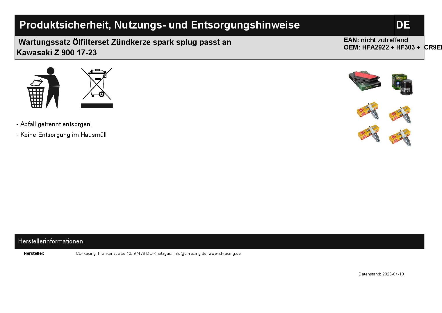 In dieser Auktion gibt es folgenden Artikel zu kaufen: Wartungskit (ähnlich Foto) Modell: passend für Kawasaki Z 900 Bj.: 2017 - 2023 Lieferumfang: 1 x Ölfilter Hiflo HF303 1 x Luftfilter Hiflo HFA2922 4 x Zündkerze NGK CR9EIA-9 Artikelzustand: neu Es handelt sich hierbei um kein Originalteil! Bei Unklarheiten oder Fragen bitte erst E-Mail schreiben.
