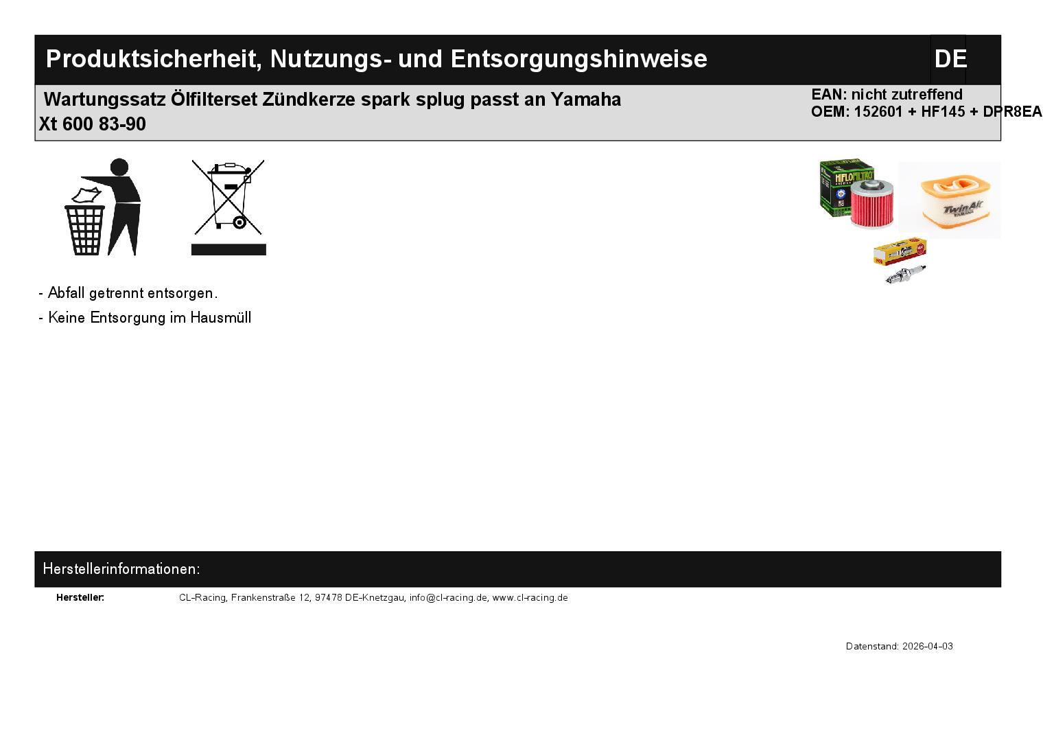 In dieser Auktion gibt es folgenden Artikel zu kaufen: Wartungskit (ähnlich Foto) Modell: passend für Yamaha XT 600 H Bj.: 84 - 90 XT 600 N Bj.: 84 - 90 XT 600 Z Tenere Bj.: 83 - 85 Lieferumfang: 1 x Ölfilter Hiflo HF145 1 x Luftfilter TwinAir 152601 1 x Zündkerze NGK DPR8EA-9 Artikelzustand: neu Es handelt sich hierbei um kein Originalteil! Bei Unklarheiten oder Fragen bitte erst E-Mail schreiben.